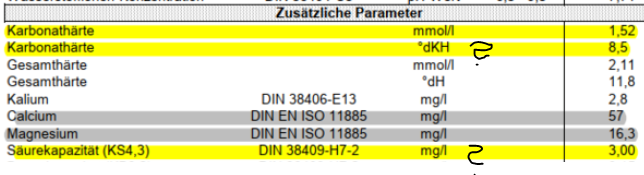 Die Einheit °dKH gibt es so nicht und die Säurekapazität(KS4,3) wird in mmol/l und nicht in mg/l angegeben. Sprich deine Säurekapazität ist nicht 3 mg/l sondern 3 mmol/l. So passen auch die Angaben für MMuM wieder (MMuM Screenshot 2).