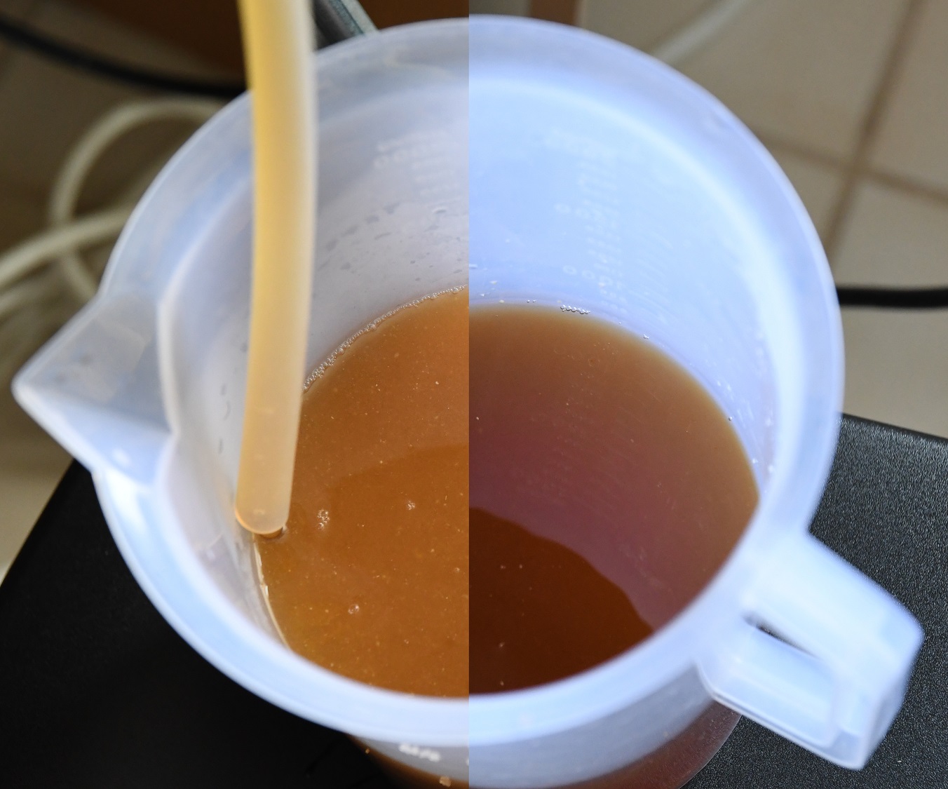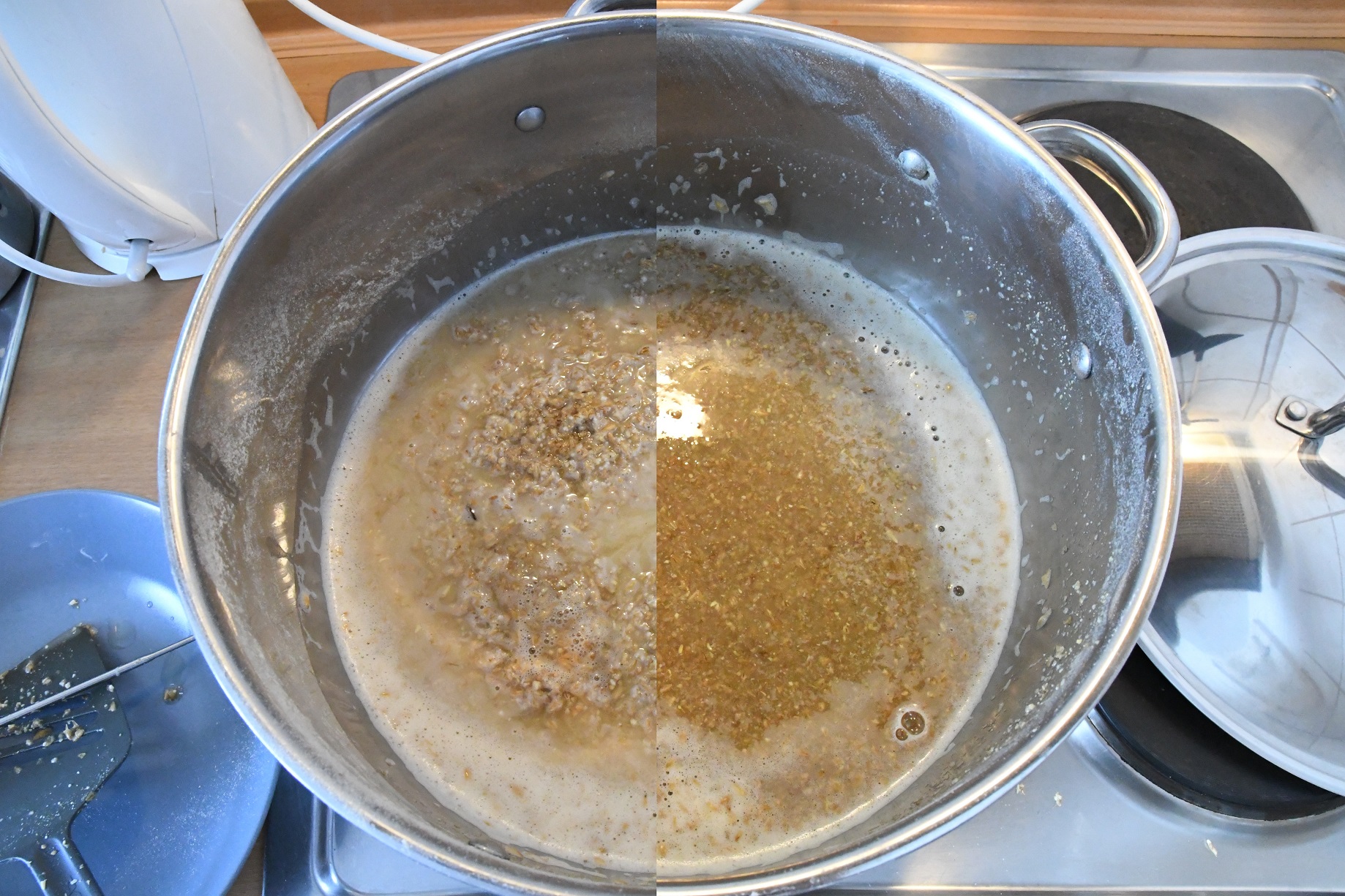 Toll wie die Dickmaische sich verflüssigt: vorher links und nach dem Kochen rechts