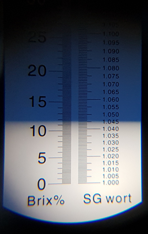 Jedenfalls wurde dann irgendwann gegen 8:45 Uhr eingemaischt. Im Thermoport. Es sollte eine Kombirast bei 69 °C gefahren werden, deshalb hatte ich den Hauptguss auf etwa 80 °C gebracht. Die Temperatur der Maische passte hinterher auch sehr gut. Feinjustiert habe ich mit etwas kochendem und etwas kaltem Wassern. Mit ziemlich genau der Zieltemperatur wurde die Maische dann schlafen gelegt. Diesmal hatte ich übrigens (im letzten Moment...) daran gedacht, die Läuterspirale einzubauen: Um 10 Uhr war dann die einstündige Siesta geahlten und ich habe die Maische wieder hervor geholt. Inzwischen allein, denn das Warten und Putzen wurde dem holden Fräulein Tochter dann doch zu langweilig. Es wurde lieber gemalt, gebastelt und für Deutsch geübt [sic!]. Die Temperatur war auf 68,2 °C gesunken. Also ca. 1 °C pro Stunde. Ob das gut ist, weiß ich nicht, aber präziser halte ich die Rasttemperatur im Einkocher auch nicht... Hauptsache Jod normal: Also Nachguss auf den Herd und Läuterturm aufbauen. Hier muss ich noch etwas am Setup feilen. Der Thermoport ist etwas breiter als mein alter Läutereinmer und steht bei dem guten IKEA-Brauständer (aka. Tritt, zweistufig) über. Außerdem mag ich diese Stapelei auf dem Tisch eigentlich nicht. Schauen wir mal... Irgendwas gibt es ja immer zu tun: Der Läutergant ist auch noch etwas provisorisch. Dadurch, dass ich zum ersten mal aus dem Thermoport geläutert habe, waren mir die Dimensionen, Anschlüsse usw. noch nicht ganz klar. Da es sich hier aber um meine letzten Schlauchstücke handelte, wollte ich sie auch nicht vorschnell abschneiden. Naja... Nächstes mal. Auf dem Bild ist nicht zu erkennen, dass der erste Schlauch offen im Trichter endet und dann unten ein neuer Schlauch ansetzt. Ist aber eigentlich klar, oder? Nachdem ich ein bis zwei Liter habe vorschießen lassen, lief die Würze wunderbar klar ab. Obwohl ich mit meinem Läutereinmer und dem MattMill-Blech super zufrieden war bzw. bin, habe ich den Eindruck, dass mit der Läuterspirale noch klarer gefiltert wurde: Bis "Pfanne voll" habe ich ungefähr 40 Minuten gebraucht. Bei ca. 27 Litern im Einkocher sind das etwa 700 ml pro Minute. Kommt mir recht langsam vor. In der Pfanne hatte ich 12,2 °B (~ 11,8 °P), was ziemlich genau der Zielstammwürze von 12 °P entsprach. Also würde ich nach dem Kochen verdünnen müssen. Mit Hilfe des 1,8 kW Tauchsieder hatte ich recht schnell eine wallend kochende Suppe im Topf. Um Überschwappen zu vermeiden, musste ich nochmal etwa 2 Liter abschöpfen. Nach 10 Minuten gab es dann die erste Hopfengabe: 38g Fuggles (2017, 5,2% alpha): Nun waren 70 Minuten Zeit. Schließlich sollte die Würze laut Rezept 90 Minuten kochen und erst 10 Minuten vor Kochende nochmal Hopfen zugegeben werden. Also war Zeit, den Elektrolythaushalt auszugleichen. Diesmal aber "nur" ein alkoholfreies Weizen. Erstens war es noch früh am Tag und zweitens musste ich Nachmittags noch (mit den Kindern) fahren. Um 12:30 Uhr habe ich dann die Kühlspirale in der Würze versenkt und die zweite Hopfengabe zugefügt. Abermals Fuggles von 2017 mit 5,2% alpha. Diesmal aber nur 12g. Zusätzlich habe ich den Kochverlust mit kochendem Wasser ausgeglichen. Am Ende lief es auf 12 °B hinaus. Da hätte ich mir einen halben Liter sparen sollen. Naja... Abweichungen unter 0,5 °P schocken mich nicht. Außerdem habe ich nun auch etwas (~4g) Irish Moss hinzu gegeben. Außerdem wurde die Hefe - diesmal Windsor Ale - rehydriert. Nun also Flameout, Kühlung an, der kritischste Teil meines Brauprozesses: