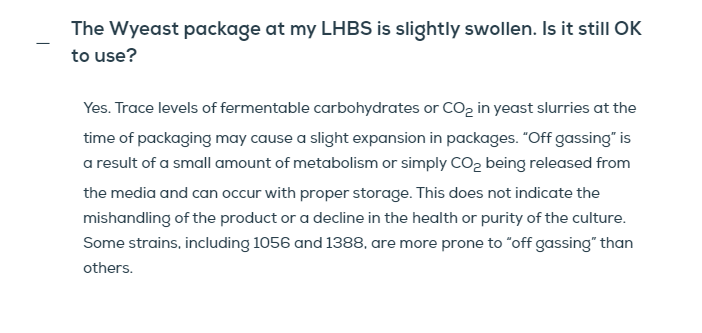 Laut FAQs bei WYeast: Laut Mashcamp (wo ich bestellt habe): Hinweis: Die Wyeast #1056 American Ale neigt stark zum Ausgasen und kann aufgrund von Restspuren an Kohlenhydraten nach der Zeit des Abpackens noch CO2 produzieren, was zu aufgequollenen Packungen führt. Weitere Info dazu findet man in den Wyeast FAQ unter Punkt 1: https://wyeastlab.com/frequently-asked-questions#r204