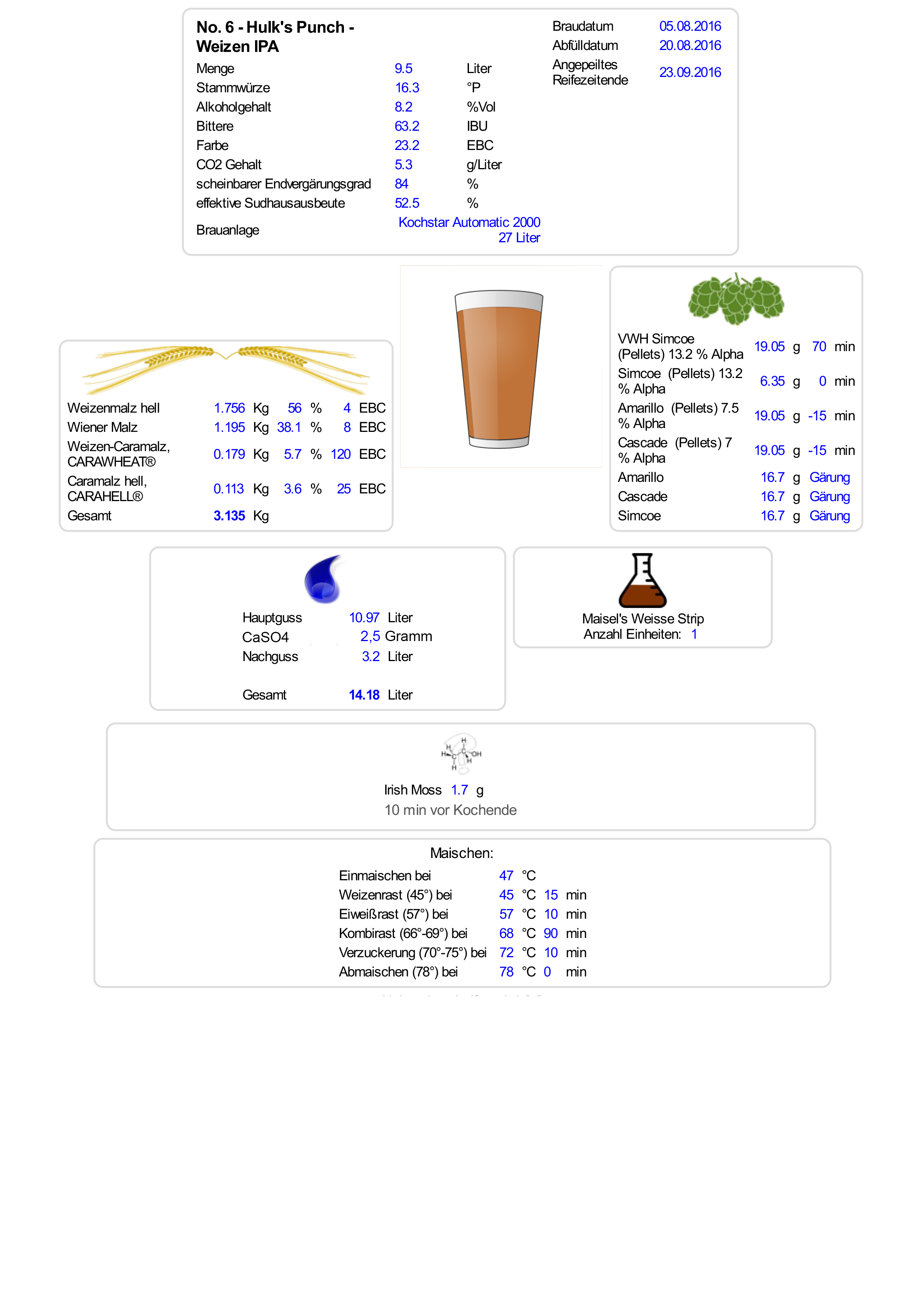 Wichtiger ist mir das Rezept. Hab derzeit ein Citra Weizen in der Kaltlagerung und gestern mal eine Flasche probiert. An sich ist es echt gut geworden. Sehr lecker, aber etwas zu süß. Und genau das sollte das Weizen IPA nicht sein. Zwar vollmundig, in Richtung East Coast IPA, aber nicht pappig süß. Es soll nach einem Glas Lust auf ein zweites machen.