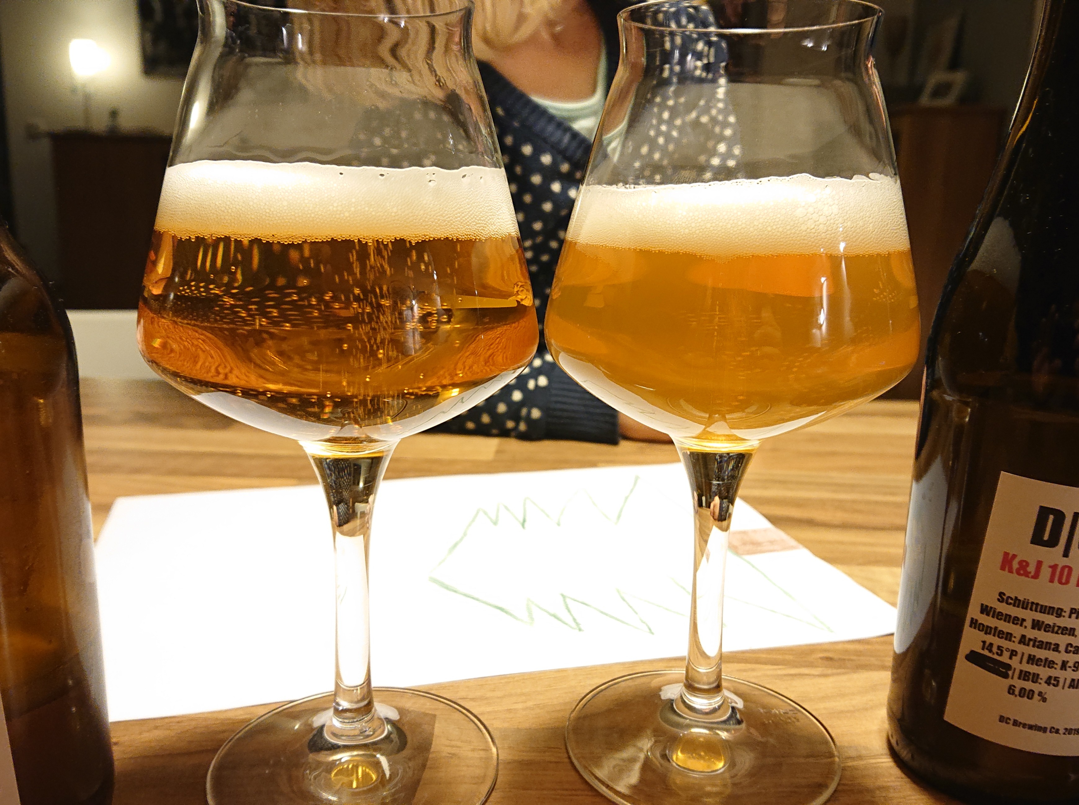 Ein IPA aus dem Juli. Sud geteilt, links US05, rechts K97. Krass, wie schlecht die K97 sedimentiert. Das IPA ist auch leicht bitterer und allgemein etwas weniger frisch, schlechter.
