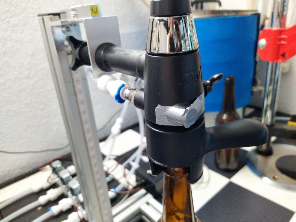 In unseren ersten Testabfüllungen hat die automatische Abfüllung sehr gut funktioniert: Flasche einhängen, System erkennt Flaschengröße, (einstellbare Anzahl von) Flutungszyklen werden durchlaufen, Bierzufluss wird geöffnet und gleichzeitig der langsame CO2-Abfluss, wenn die Flasche voll ist, wird der Bierzufluss gestoppt und gleichzeitig der schnelle CO2-Abfluss...die Flasche kann nun entnommen werden und die nächste Flasche eingehängt werden.