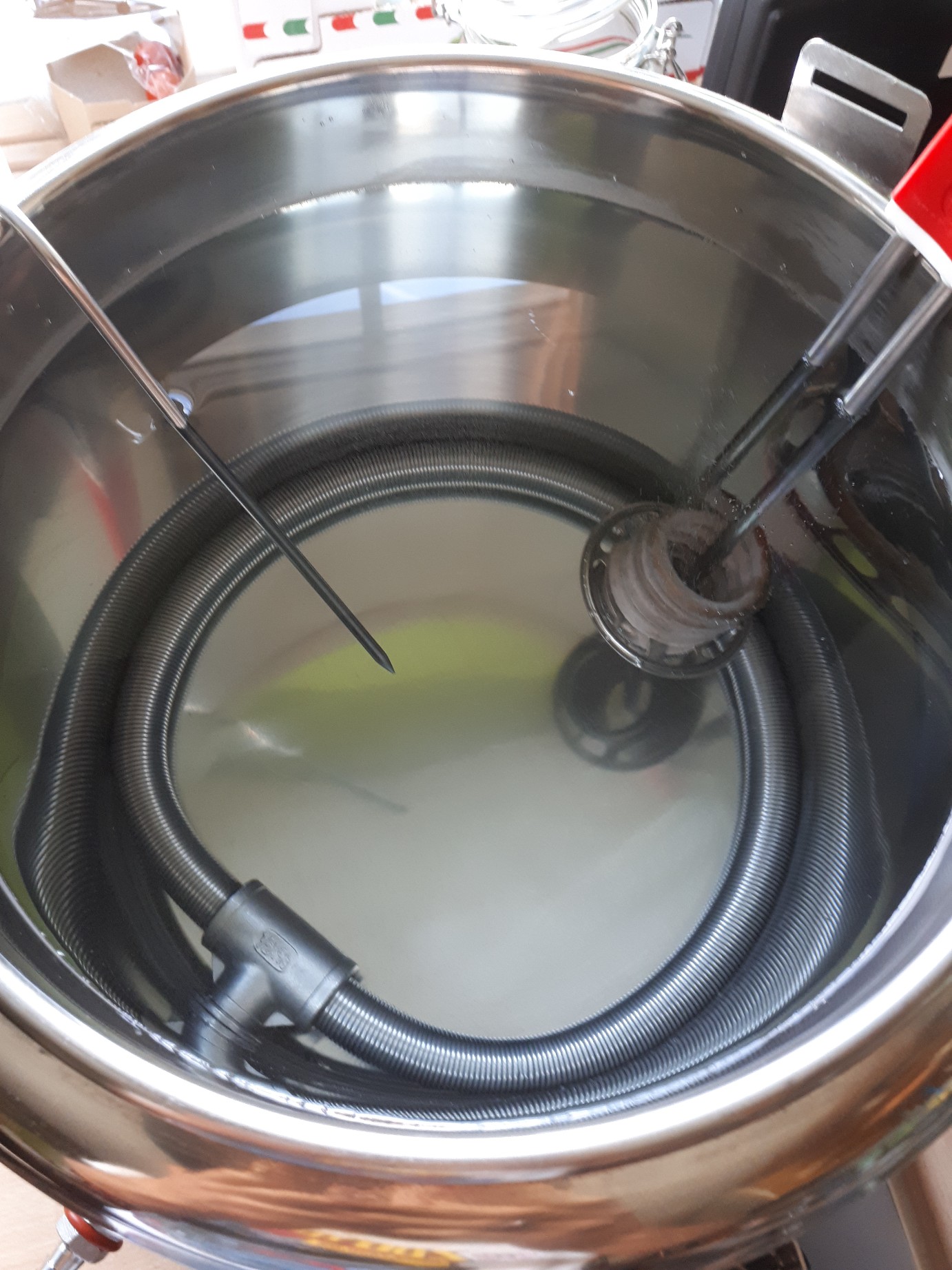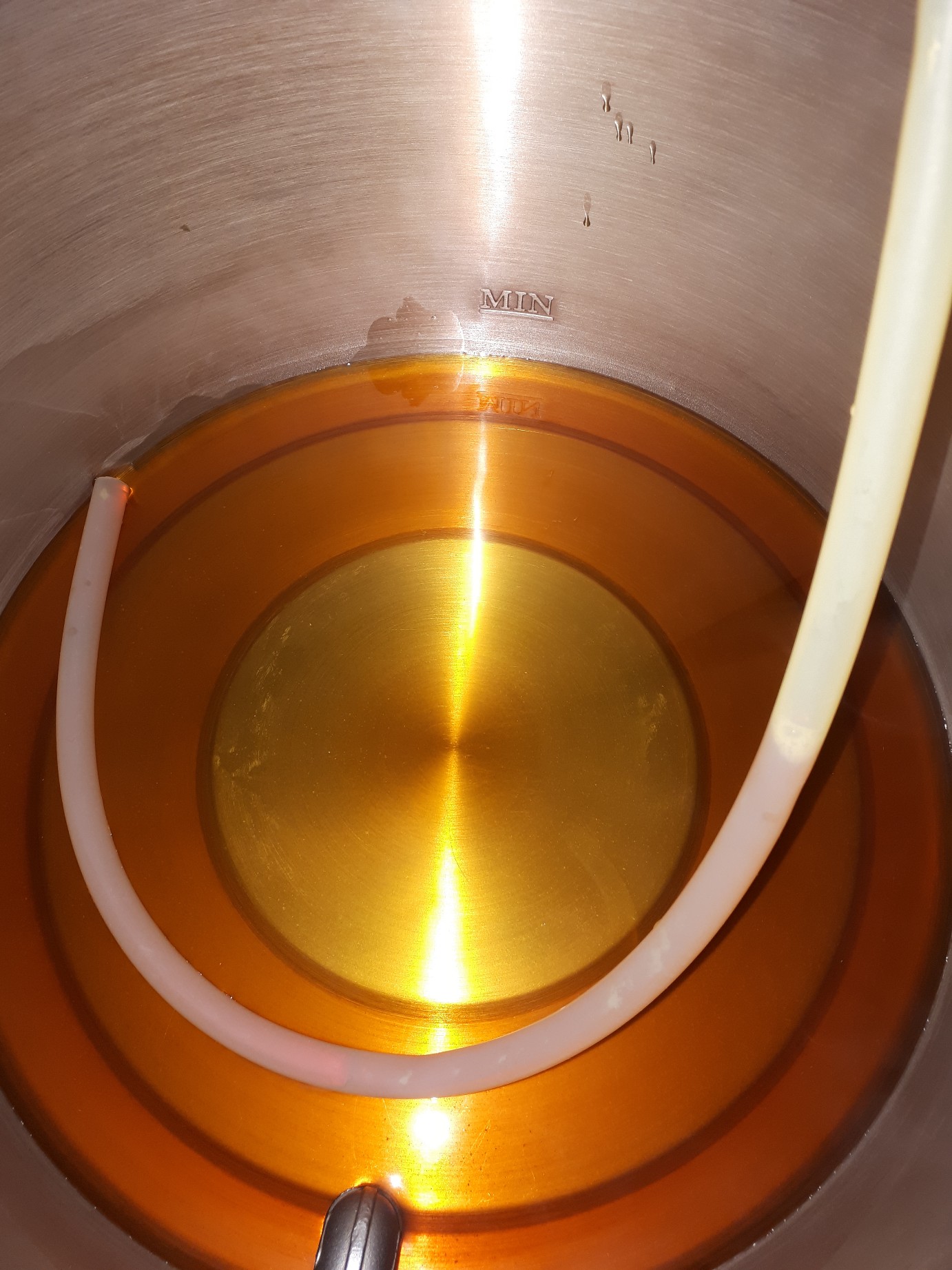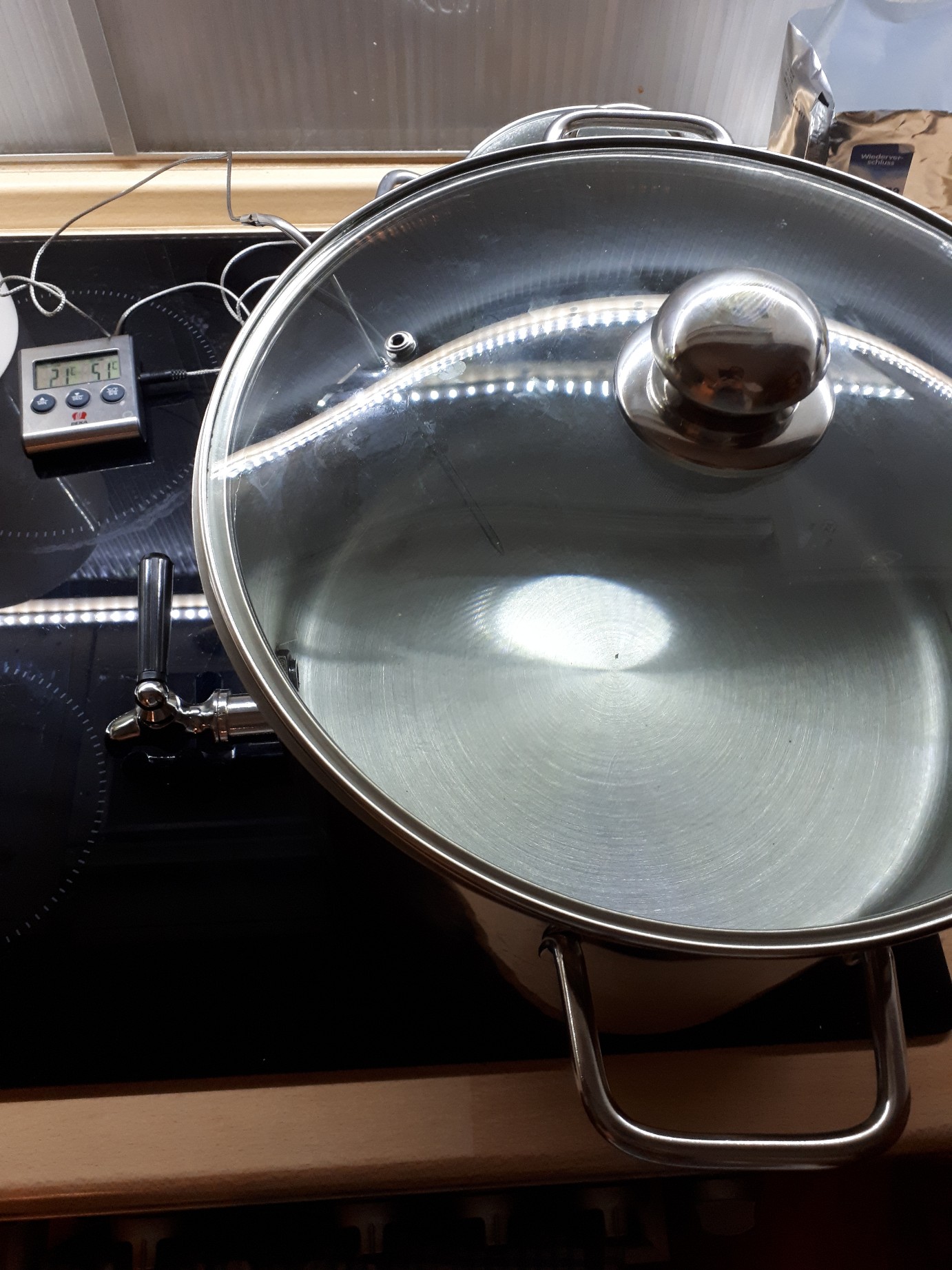 Ergab ca 13,2l nach dem Kochen plus rund 1l Starter der beim Kochen abgezweigt wurde. Also Würzemenge nach dem Anstellen ca 14l mit 12,9°P