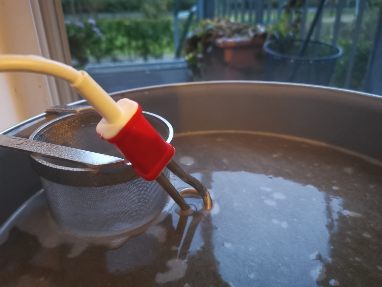 Dann wollte der Thermoport einfach nicht dichthalten. Alles nochmal überprüft. Der Hahn leckt. War jedoch so festgedreht, dass er sich nicht mehr öffen ließ (übrigens bis jetzt). Nach etlichem Hin- und Herkippen des Einmaischwassers wurde etwas Gummiband um den leicht tropfenden Edelstahlhahn gewickelt und ein kleines Gefäß untergestellt.