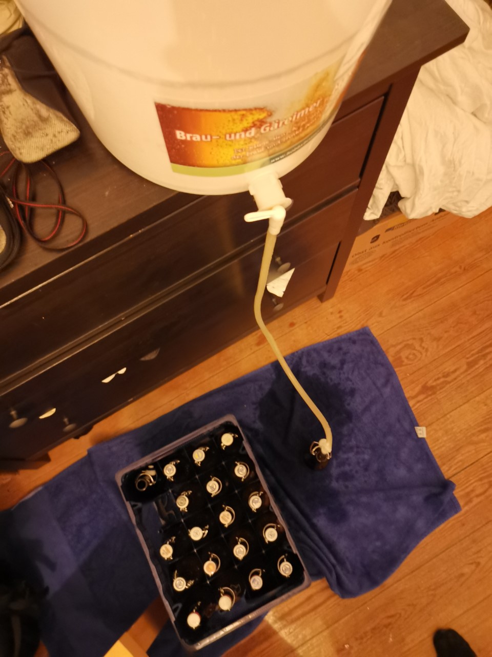 Schnell den Gäreimer, respektive den Auslaufhahn richtig verschlossen. So.