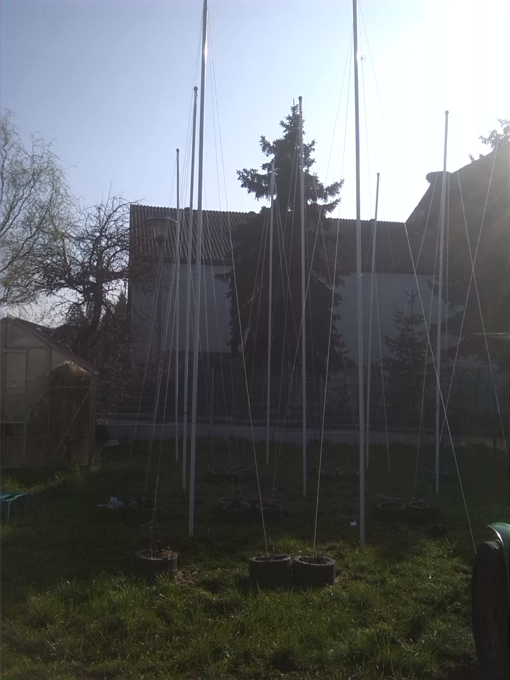 Ich hab bei mir im Garten 12 Alustangen je 8 m Einbetoniert. An diesen MAsten ziehe ich jeweils 4 Seile hoch . An denen kann sich der Hopfen schön hochranken und ich spar mir das Geld für weitere Stangen. Komme somit auf 36 Hopfenpflanzen. Sind jetzt seit 3 Jahren im Boden. Freue mich schon auf die Ernte dieses Jahr!