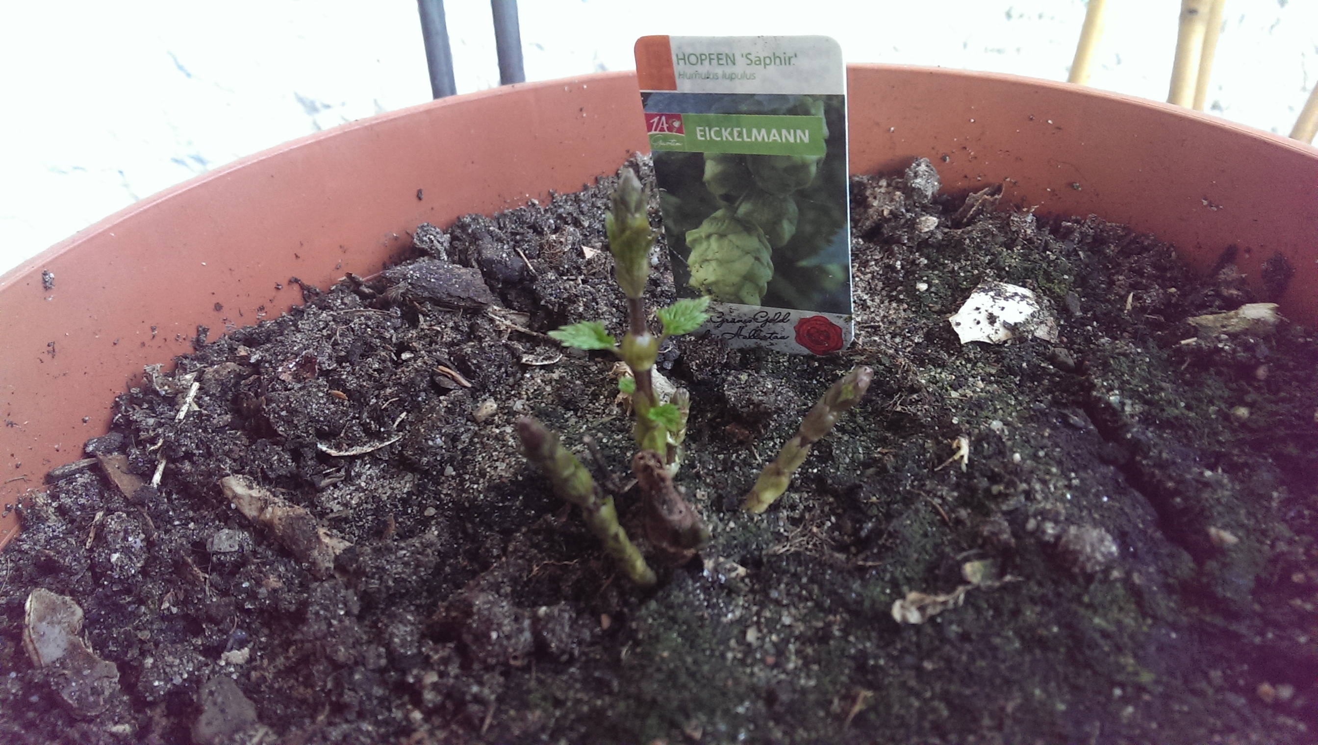 Letzten Herbst habe ich mir einen kleinen Hopfengarten angelegt und je drei Saphir, Tettnanger und Tradition gesetzt, die mittlerweile auch schon zaghaft austreiben.