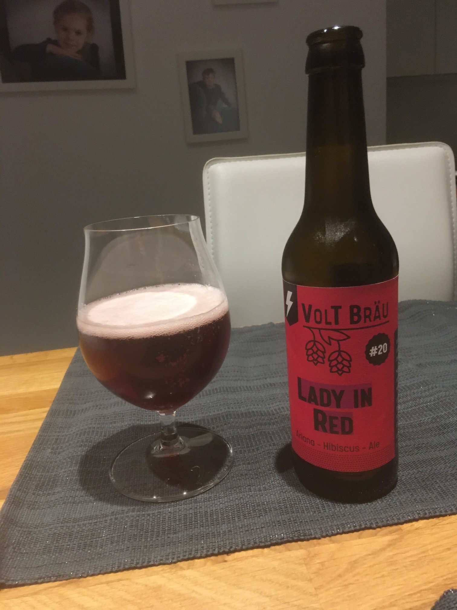 Unter dem Namen "Lady in Red" Kommt ein "Ale mit Hibiscusblüten" daher. Schon beim Einschenken zeigt das Bier eine Lila Farbe, der Schaum ist Rosa - das ist schonmal ungewöhnlich! Als Hopfen kommt hier Ariana zum Einsatz. Mir ist es nicht gelungen die Aromen vom Hopfen und die der Hibiskusblüten zu differenzieren, aber das Aroma gefällt, offensichtlich gut ausgewählt die Kombi. Restsüße fällt eher gering aus, dafür ist eine leichte Säure wahrnehmbar. Ein wirklich schönes Bier, sowas habe ich bisher noch nicht getrunken!