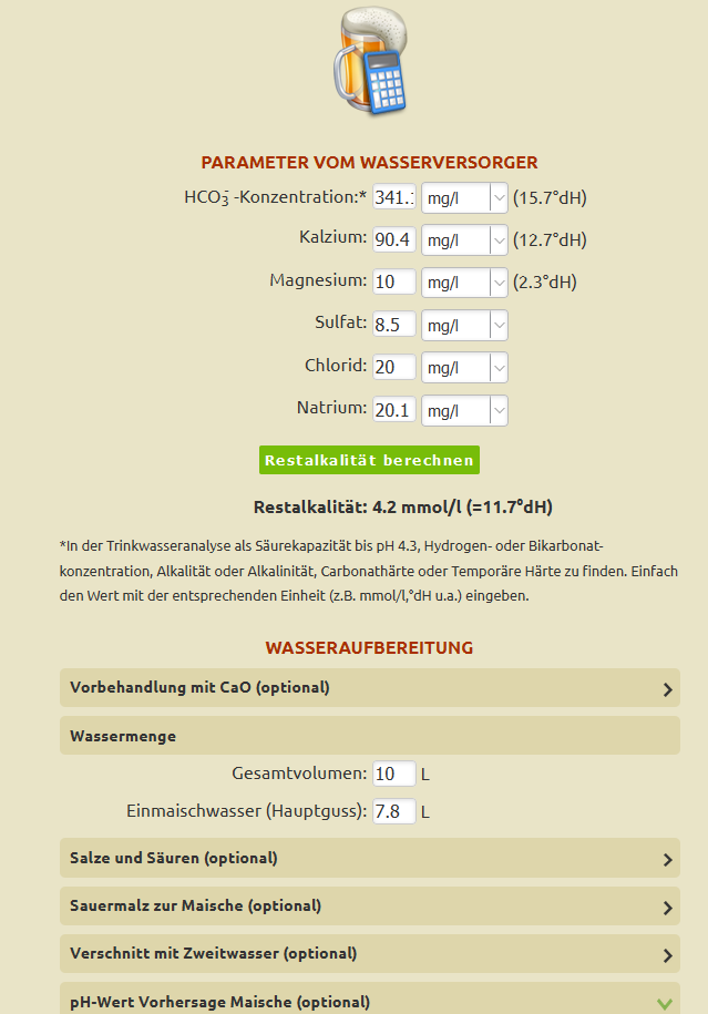 Ohne Wasserbehandlung: Sauermalz kaufen - Menge für Zielwert Maische-pH 5,6 über den Wasserrechner bestimmen