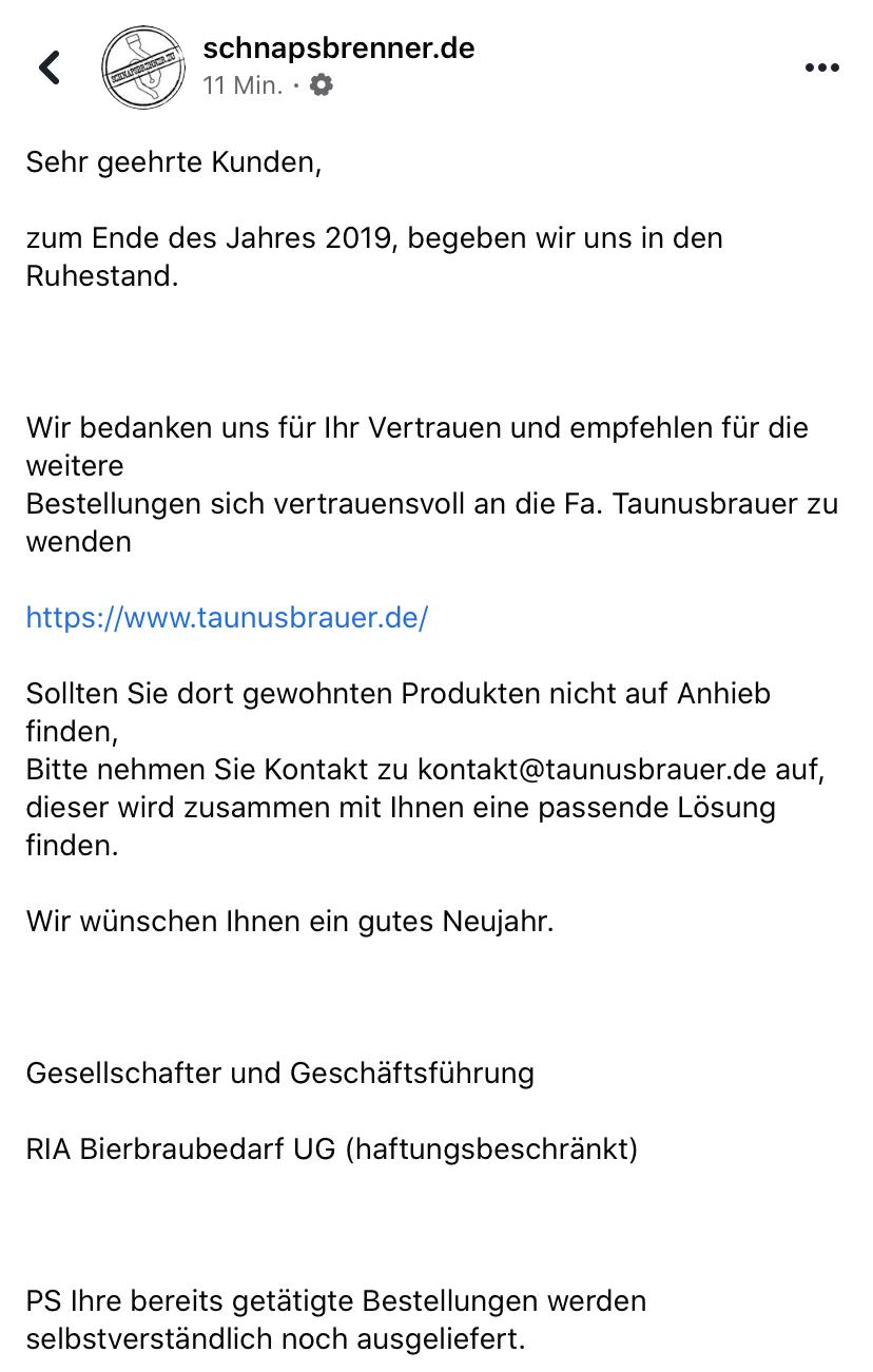 Nach meinen Informationen hat der Taunusbrauer einige Restbestände übernommen und wird als Gegenleistung in der Abschiedsmeldung von Schnapsbrenner (siehe Eingangsthread) erwähnt. Die Shops unterscheiden sich doch sehr, es ist also keine klassische Übernahme oder "unter neuer Leitung".Bierwisch hat geschrieben: Donnerstag 2. Januar 2020, 12:57 Wie ist das mit dem "Weiterführen" durch Taunusbrauer zu verstehen? Wird es den Shop, so wie er ist, weiterhin geben? Finde ich die Produkte ab sofort unter der neuen Adresse?