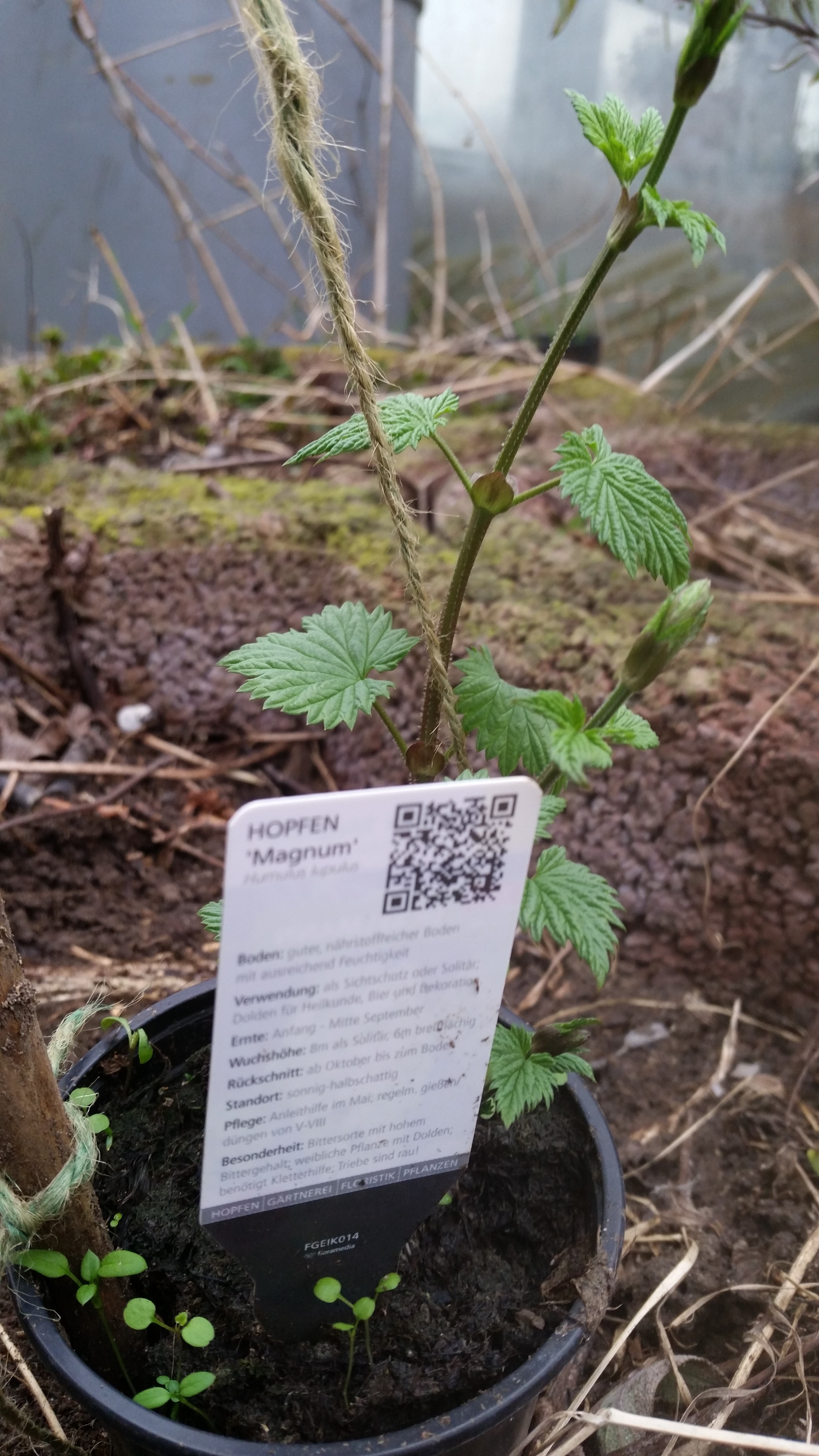 Letzten Herbst habe ich mir einen kleinen Hopfengarten angelegt und je drei Saphir, Tettnanger und Tradition gesetzt, die mittlerweile auch schon zaghaft austreiben.