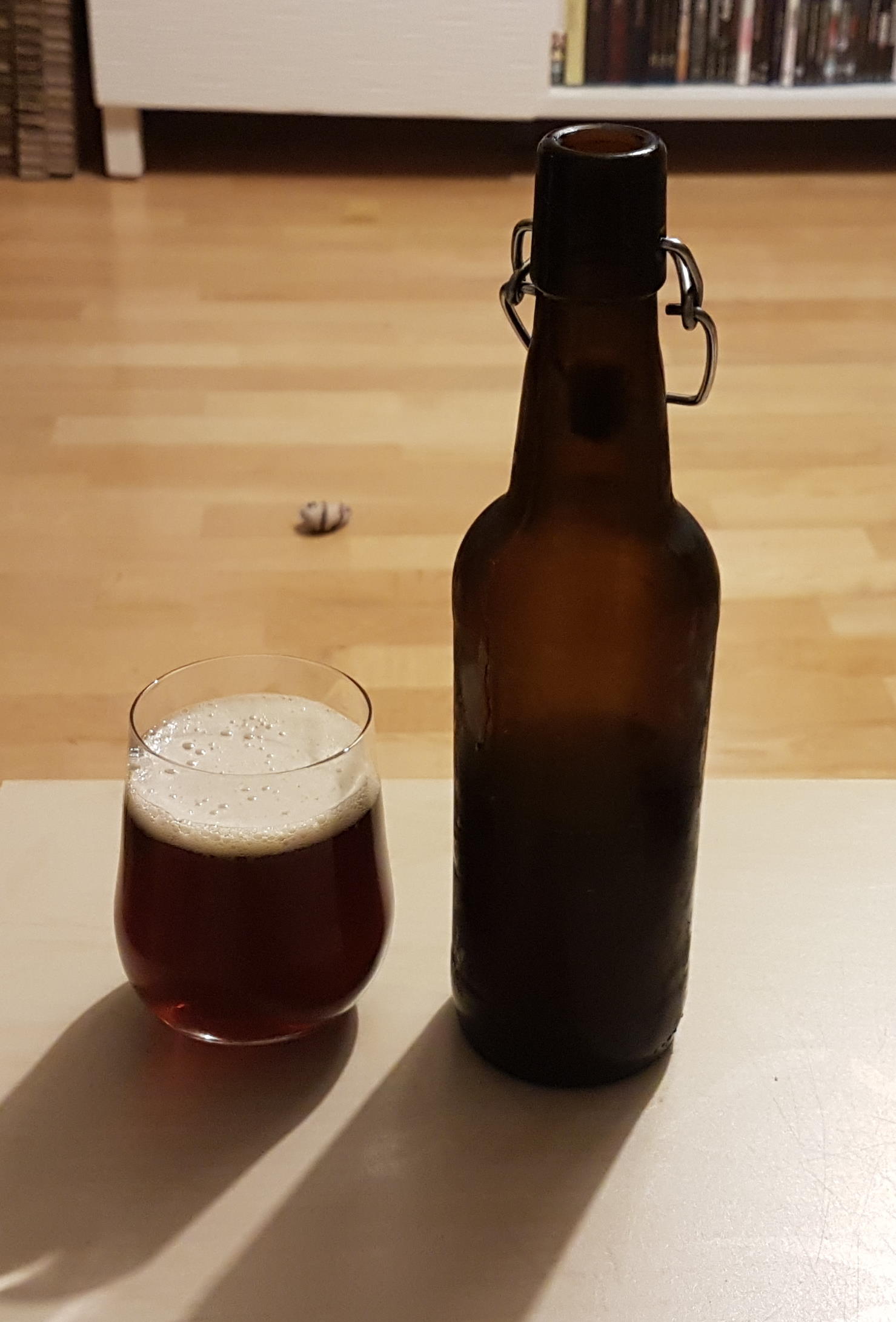 Sieht auf dem Bild wegen der Belichtung etwas dunkler aus als es ist, liegt aber glaube ich trotzdem leicht über den im Rezept angegebenen 7 EBC.