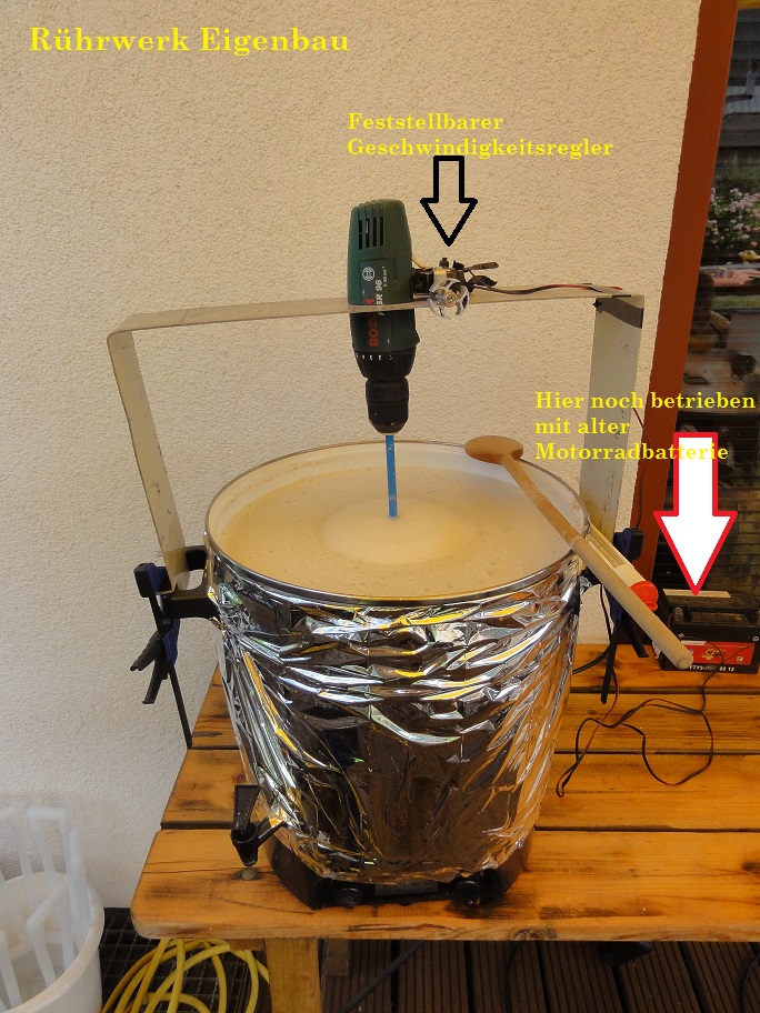 Von der Dicke der Maische sollte es allerdings mit dem Betonrührer und Akkuschrauber funktionieren. Wenn du es ausprobiert, schreibe bitte deine Erfahrungen in diesen Threat.