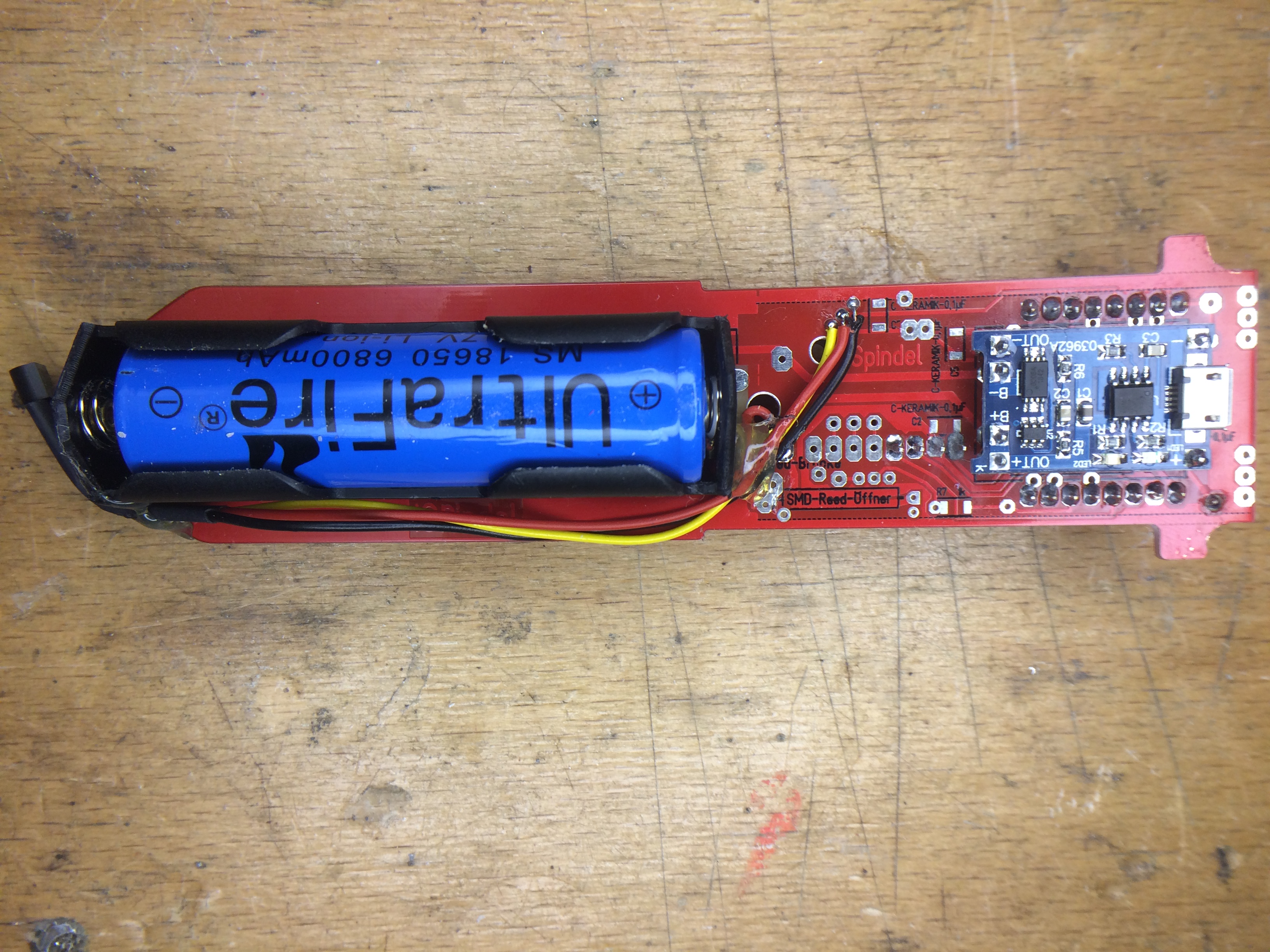 Bei angeschlossenem USB: Wemos (+ GY521) gezogen, die rote LED am Lademodul leuchtet.