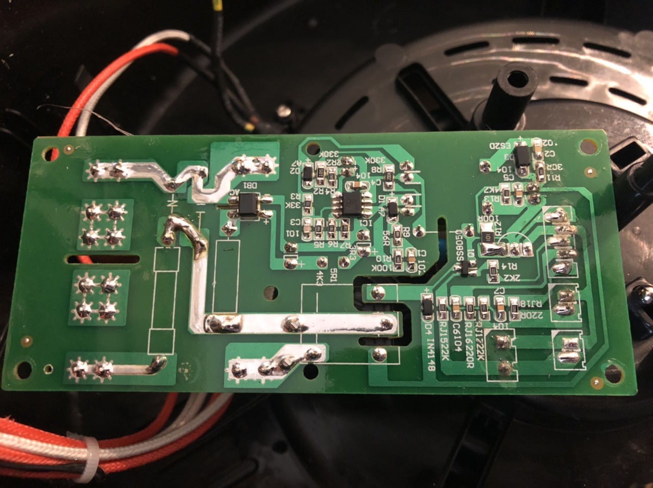 Ich hänge mich hier mal vorsichtig dran, weil ich gerade vor dem gleichen Problem stehe. Mein Einkocher ist zwar von Kesser, aber er hat die gleiche Platine, wie hier besprochen. Ich habe mal auf meinem Foto die beiden Punkte, die ich mir zur Brückung denken würde, rot eingekreist. Könnte das passen?