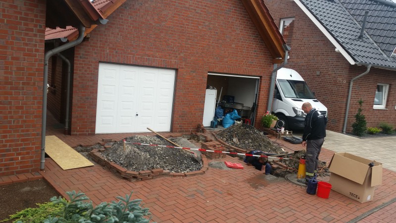 Mein alter Herr stemmt gerade den Beton der Pflasterkantensteine auf. Auch wurde schon der erste Abschnitt des Schachts ausgehoben. Rechts ist übrigens der Hobbyraum.