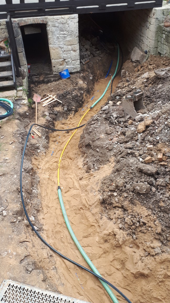 Als nächstes wurde die Wand zur Brauerei aufgebrochen. Hier soll zukünftig das Abwasserrohr und ein Leerrohr in den Raum führen. Das Leerrohr wird bestückt mit einem Strom- und Cat7 Kabel. Außerdem wird noch eine Zugschnur durchgelegt. Wir planen auch ein Holzhaus am Ende des Gartens und eine solche Gelegenheit fürs Kabelziehen gibts selten. ;-)