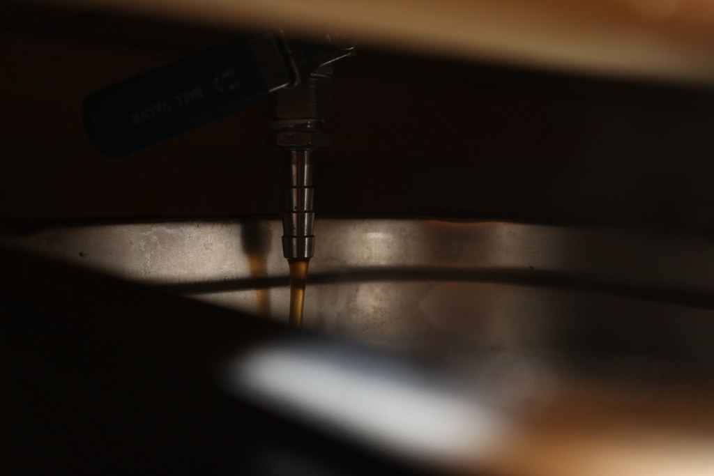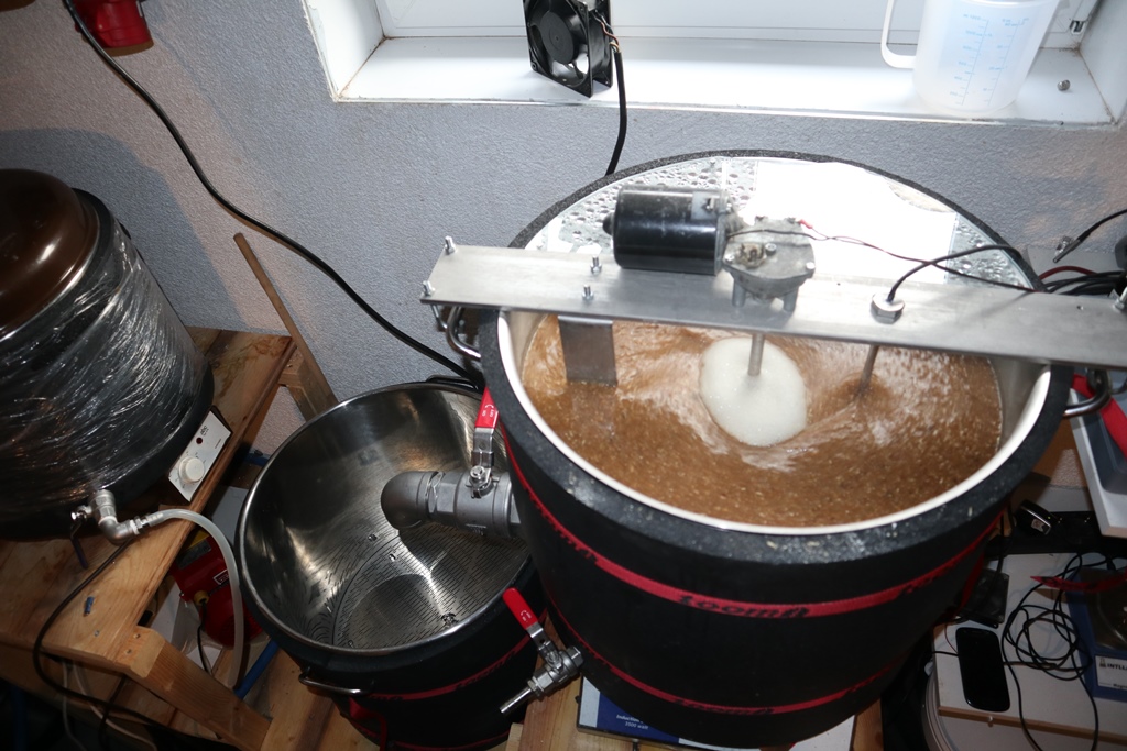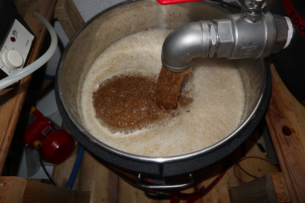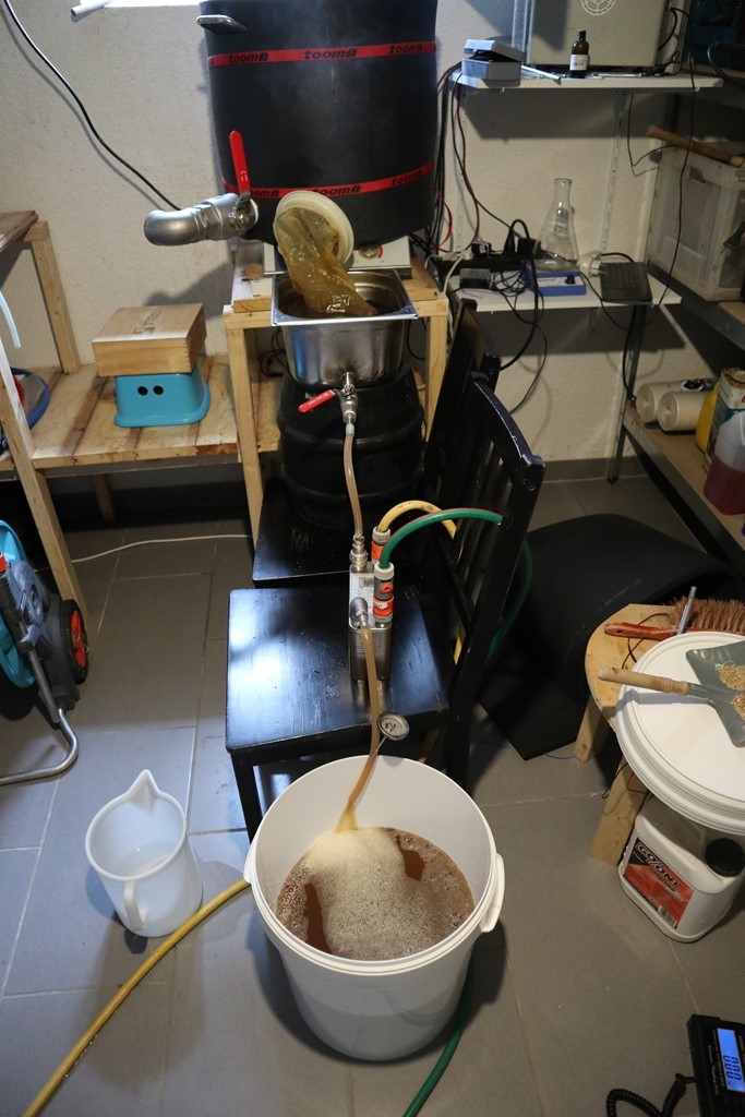 6.00 Uhr Leitungswasser ist auf 58°C gestiegen, nun wird eingemaischt 8:30 Uhr Maische ablassen und 20 min Läuteruhe 8:55 Läutern, dabei achte ich immer darauf das es immer 600-800ml pro min einstelle.
