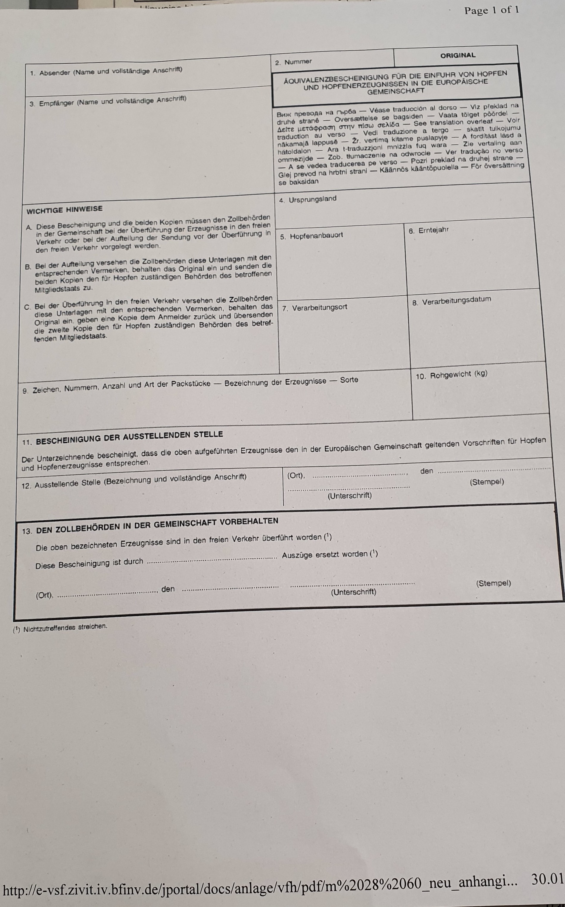 Der Haupt Problem ist aber, Wo Sie bestellt hat, die haben bestimmt es nicht richtig gesendet (mit der Form ganz oben ausgefüllt, Äquivalenzbescheinigung) und alles auf Deutsch. Leider ist der Problem Sie haben gekauft von ein zwischen handler und dort haben die kein Offiziell Äquivalenzbescheinigung zum geben.....nur Yakima Hops hat es....Yakimavalleyhops ist ein zwischen handler und kein offiziell teil von yakima hops)
