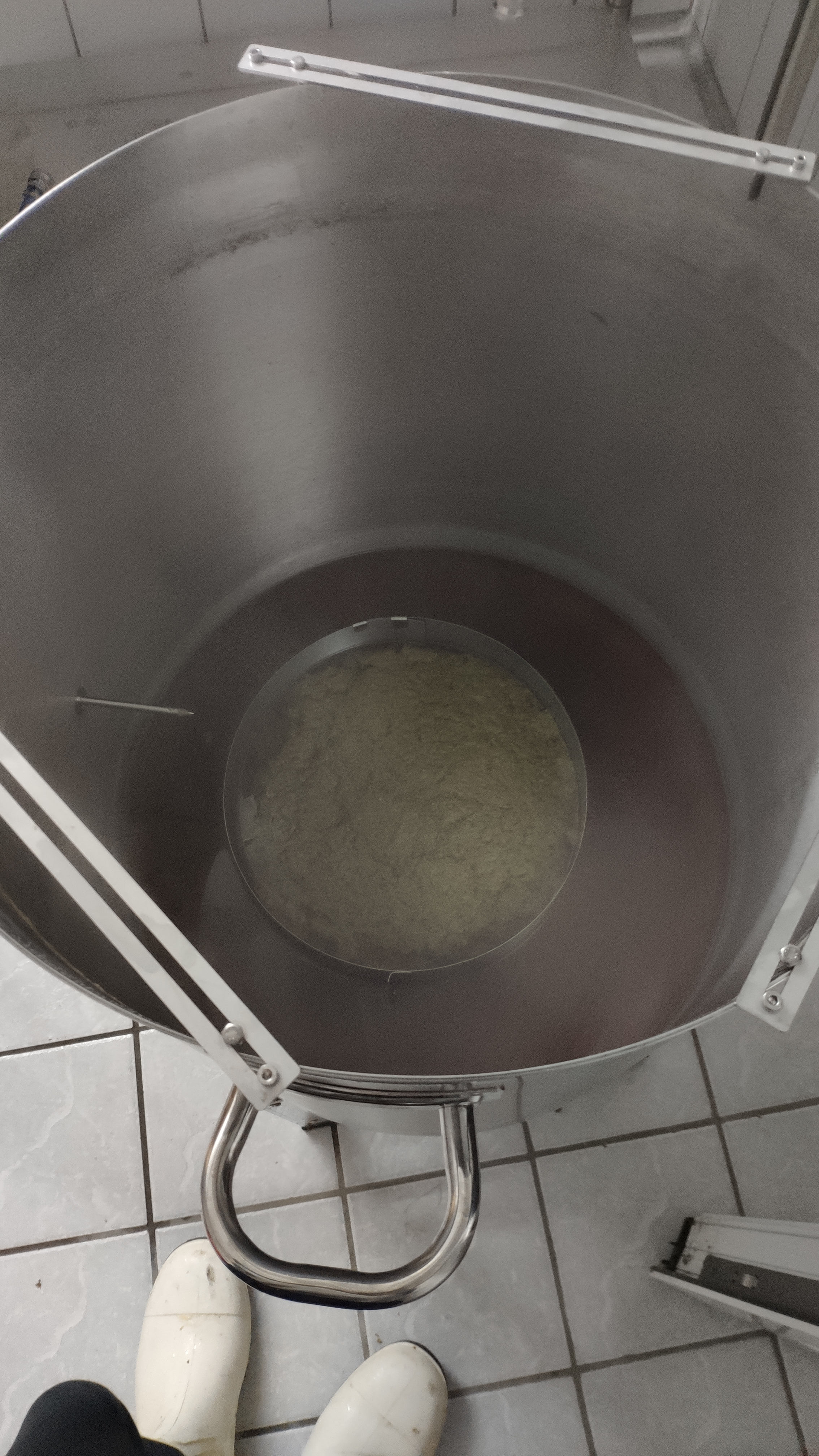 Interessant ist dabei, dass die Yato ca. 100 Watt mehr Leistung aufnimmt, wenn der Topf auf den Streifen steht. Yato und Heißwasserbereiter werden vom Craftbeerpi gesteuert, zusätzlich wird noch die Temperatur am Ausgang des PWT angezeigt. Der Maischetopf ist mit Rührwerk und Läuterhexe ausgestattet. Nachguss macht ein Klarstein Konfistar 50 - durch die Schichtung der Temperaturzonen kann man den (im Boden) eingebauten Thermostaten zwar vergessen, aber für den Nachguß reicht es mit dem selbst eingebautem Sensor. Nach dem Einmaischen rotiert die erste Teilmaische und wird anschließend gekocht. Die Earl'sche Tabelle zur Berechnung der Teilmaischen hat bestens funktioniert - mit dem zweitem Teil Hauptguss und Schrot wurde die Zieltemperatur optimal erreicht. Rechtzeitig den Nachguss auf 85° heizen, den lasse ich dann noch durch Pumpe und PWT zirkulieren (wegen den bösen Bakterien :) Bis zum Abmaischen ist der Nachguss dann auf ca. 75°. Mit 63 Litern ist der Maischetopf ordentlich voll, aber Yato und Rührwerk halten das problemlos aus. Läutern - ich weiß, nicht optimal, aber auch im zwanzigsten Jahr hat mich die Läuterkatastrophe nicht erreicht.