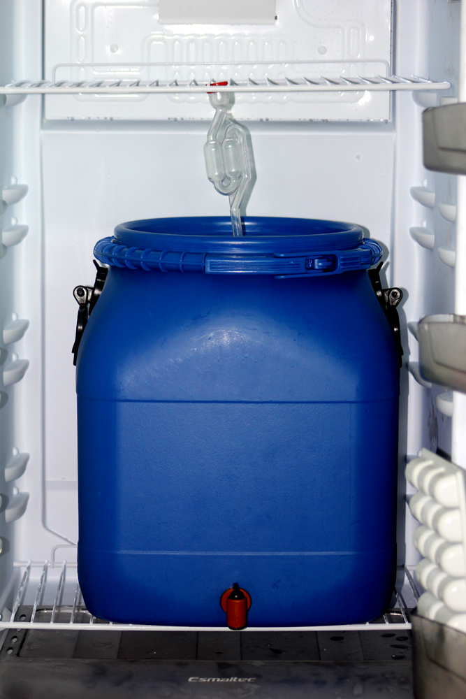 Unten mein Kühlschrank, unten stell ich ein 20 Liter Gärgefäss und eine Etage drüber ein 30 Liter Gärgefàss. Geregelt wird mit einem digitalen Thermostaten. Solltemperatur und zulässige Hysterese eingestellt. Der Fühler wandert durch die Türdichtung. Der Thermostat schaltet die Stromzufuhr des Kühlschranks. Ausserhalb der Gärung wird der Kühlschrank zur Reifung normal, einstellbar über eingebauten Regler von 1 bis 10 ºC, betrieben.