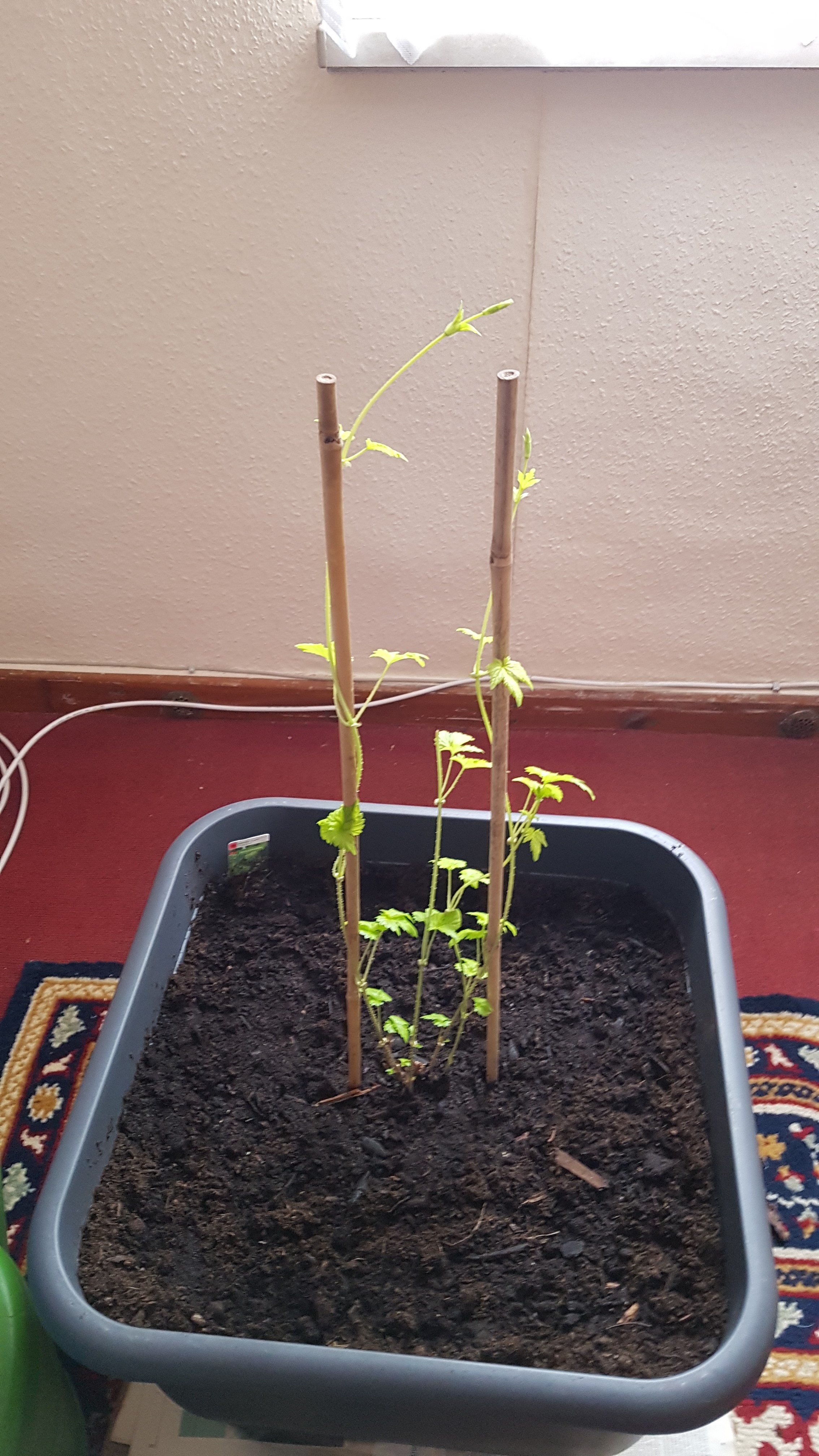 Da einer der Triebe bereits etwa 1.5 Meter lang ist wollte ich den eigentlich mitnehmen beim umsetzen. Ich habe den jetzt sachte um die Stange gewickelt und festgebunden. Er wirkt aber noch immer sehr schlaff. Es sind jetzt erst zwei Tage aber ich frage mich ob ich den Trieb nicht doch aufgeben und abschneiden soll damit die zwei anderne Triebe (einer erst 1-2 cm) begünstigt werden.