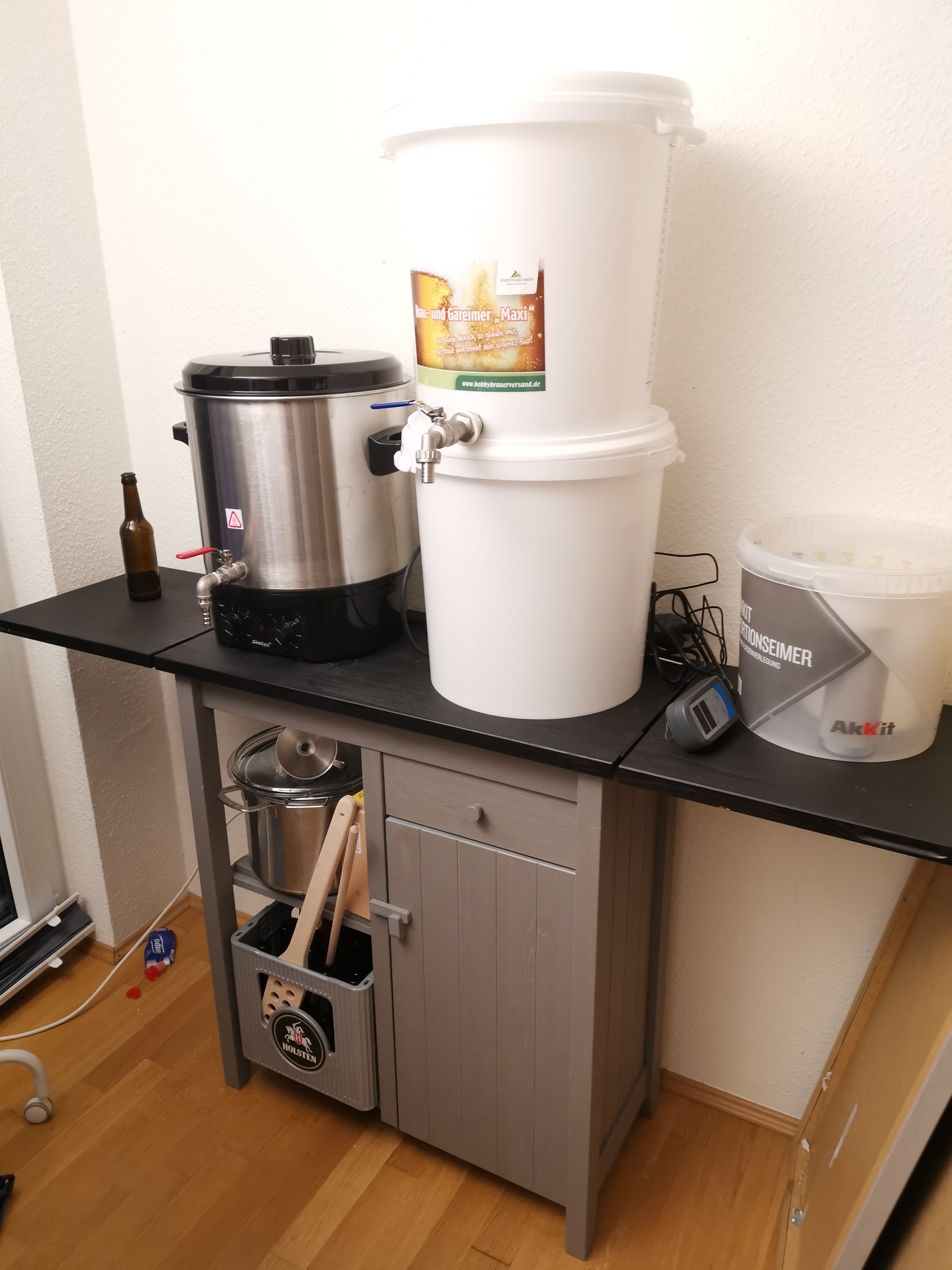Mit dem Equipment habe ich dann meinen ersten Sud gebraut, Schwachstellen erkannt, Nachfüllset besorgt und nun u.a. auch mit Bierspindel und Jod nachbessern können und seit dem auch langsam die Einkocherklasse ausgerüstet.