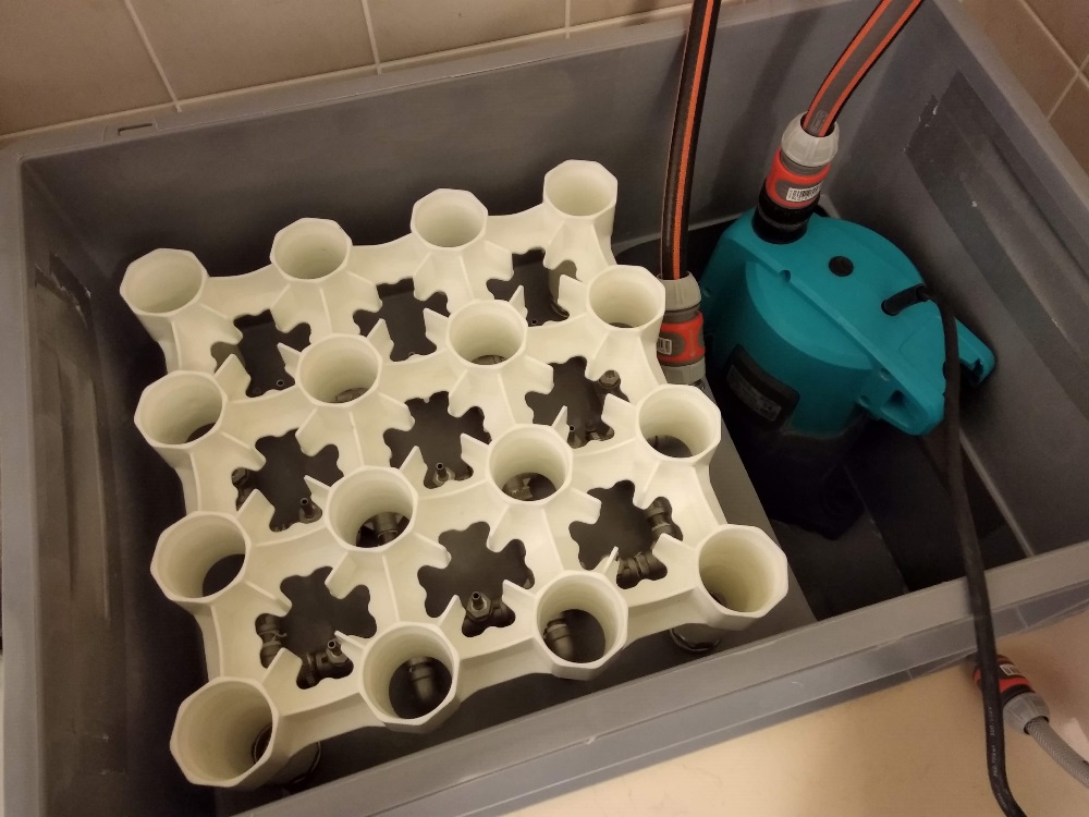 Du hast in Deiner finalen Konstruktion 17 Düsen, wenn ich richtig gezählt habe. So wie ich es verstanden habe, hattest Du vorher mehr und der Druck war zu niedrig. In dem Zusammenhang würde mich interessieren, welche Pumpe Du verwendest. Wie schätzt Du die Situation bei 12 Düsen ein? Ich will natürlich nicht, daß die Flaschen abheben und natürlich sich auch nicht auffüllen.