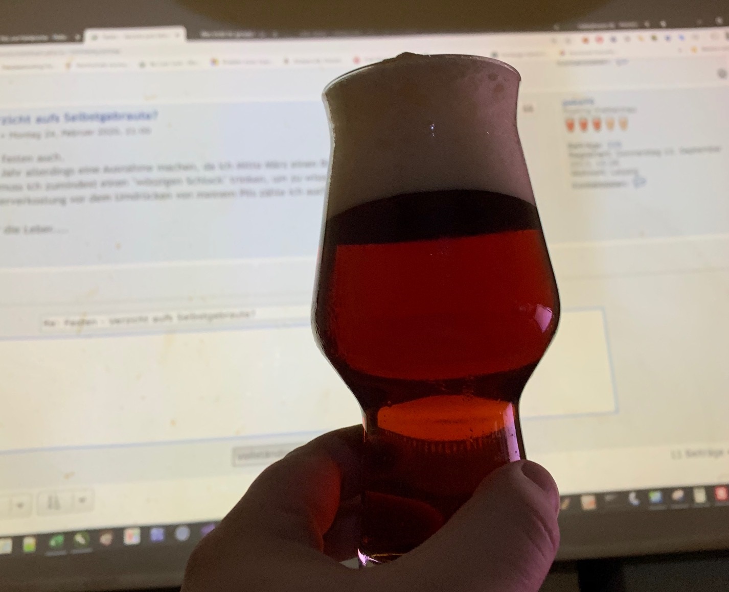 Ich hatte soeben einen Jährling im Glas, er war durchs Röstmalz eher dunkel, dafür aber glanzfein. Hopfen T'n'T war nurmehr schwach, wen wundert's, aber immerhin war er noch da. Ein erfreuliches Bier, könnte ich mal wieder machen.
