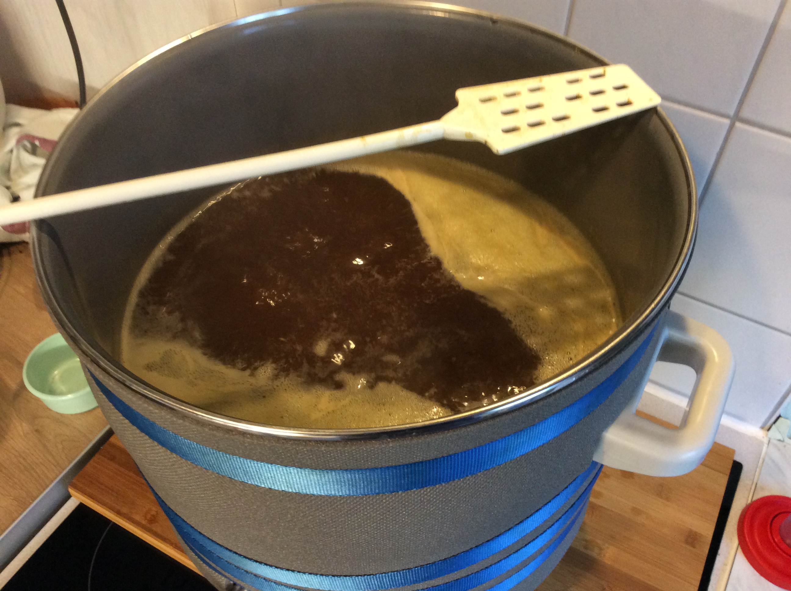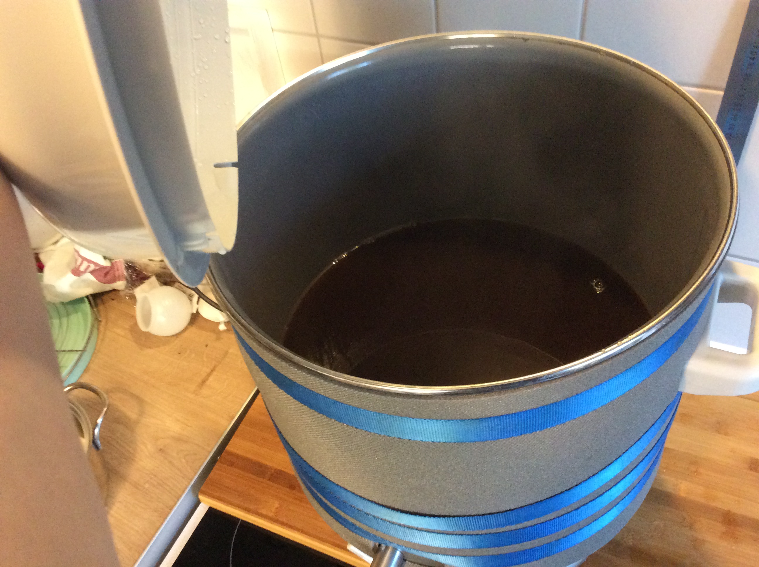 Dann lief der Treber komplett trocken. Hahn zu und das bereits auf 67 Grad erhitzte Wasser reingegossen und alles nochmal ordentlich verührt.