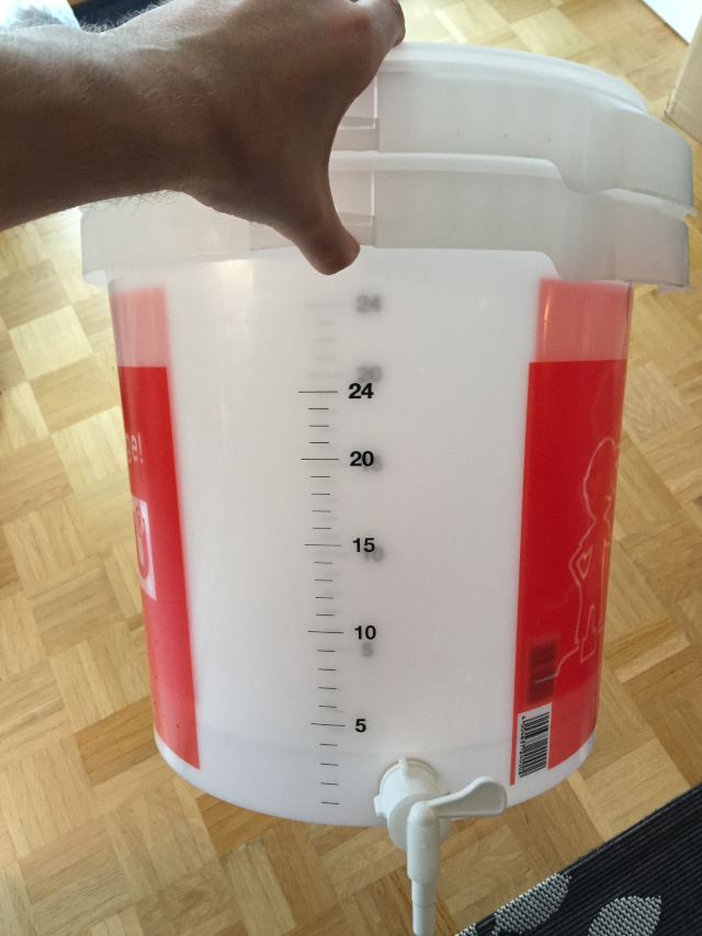 Beide Eimer in ineinander gestellt, im äußeren natürlich so einen Hahn wie er an den meisten 30l-Eimer-Gärbottichen dran ist.