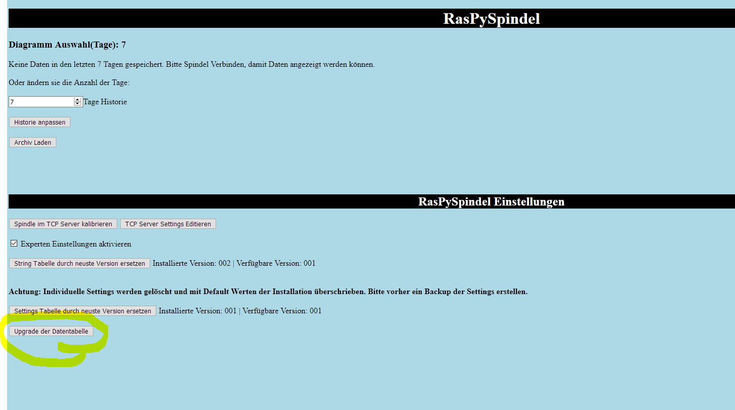 I can not find where to set this. TCP-Server is running. iSPindle.py is running, ISpindle is sending messages. But now records are added to the Data Table and the screen is still saying "No spindle data received in the past 7 days. Please connect Spindle to generate data."