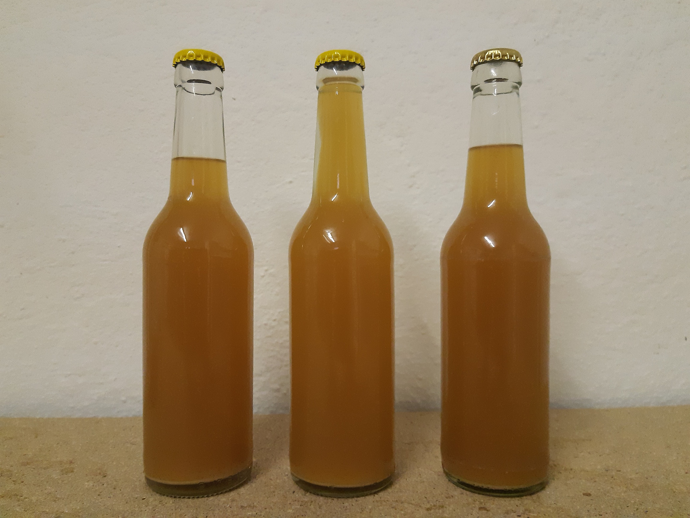 Das Bier wurde von unten aus dem Gärfaß abgezogen und abgefüllt. Die Flasche mit dem goldenen Kronkorken ist die mit dem ersten und dem letzten Bier aus dem Fass, hier ist also übermäßig viel O2 reingekommen. Die anderen beiden wurden gleich befüllt, lediglich wurde bei einer der Kopfraum sehr klein gehalten. Es wurde kein CO2 in den Flaschen vorgelegt. Alle 3 Flaschen sind bis zum 1.März bei Zimmertemperatur gestanden und ab dann bei ca. 5°C gelagert (immer an einem dunklen Ort).