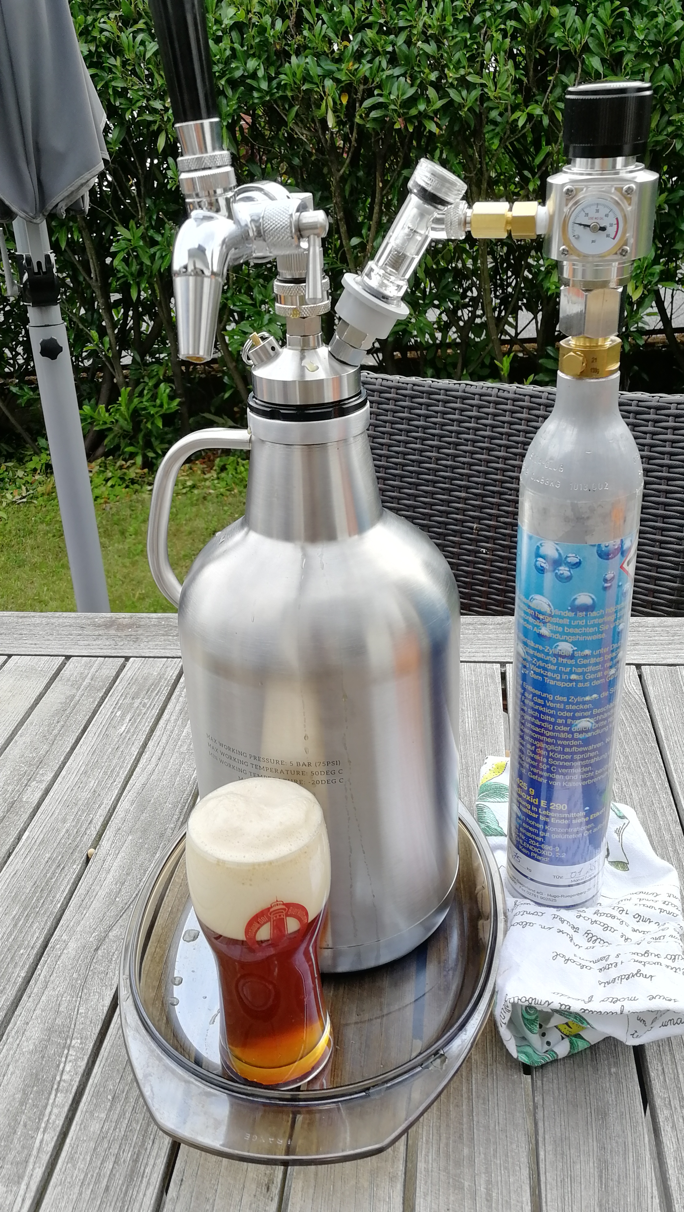 Damit hast Du ein 19L NC Keg und ein 3,75L Mini_Keg aus dem zu Zapfen kannst mit allem nötigen Zubehör. Ich würde aber eine Kombination mit Soda-Stream Adapter und Flache bevorzugen. Mit den Patronen ist Zwangskarbonisieren eher ein phantastisches Abenteuer.