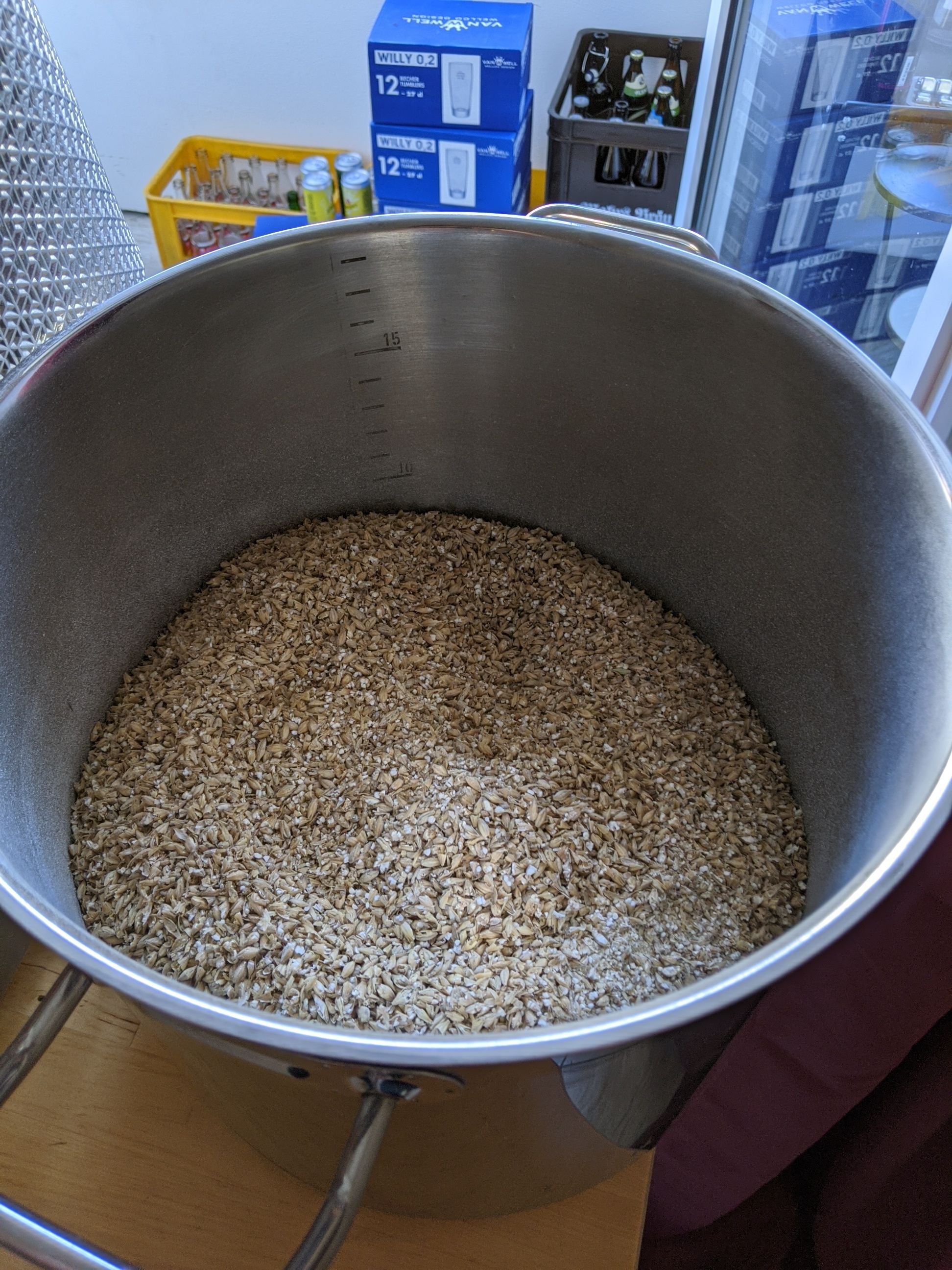 Gemessen habe ich vor Kochbeginn dann 13°P bei 17 L (SHA 53%). Nicht überragend, aber ok bei BIAB. Dazu kamen dann noch 3L kochendes Wasser, um ~11°P zu Kochbeginn zu haben.