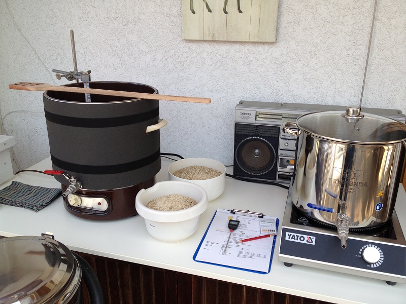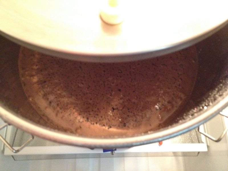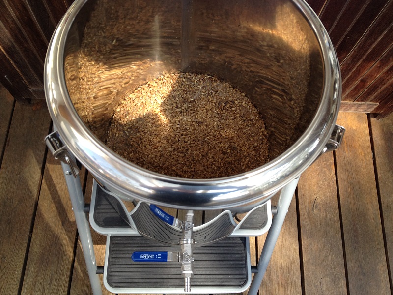 Schwierigkeiten hatte ich beim Ablassen der Maische in den Läuterbottich. Leider gibt es hierzu kein Bild. Der innere Durchmesser des von mir montierten Ablasshahns (siehe Bild 2 mit rotem Griff) ist irgendwie zu klein gewählt. An der Ablauföffnung im Einkocher bildeten sich, ich nenne sie mal „Schrotnester“, die weiteren Treber filtrierend zurückhielten. Durch etwas Bewegung mit dem Braupaddel bekam ich dann zwar das meiste durch Hahn und Schlauch, einiges blieb aber zurück und musste von Hand über die Behälterkante umgefüllt werden. Das Läutern über den falschen Boden im Thermoport und das Aufbringen der Nachgüsse ging meiner Meinung nach ganz gut.