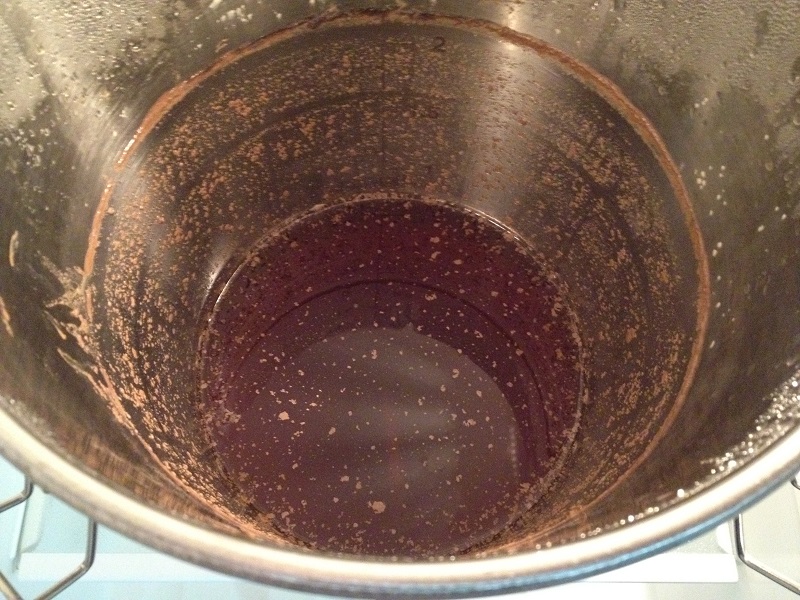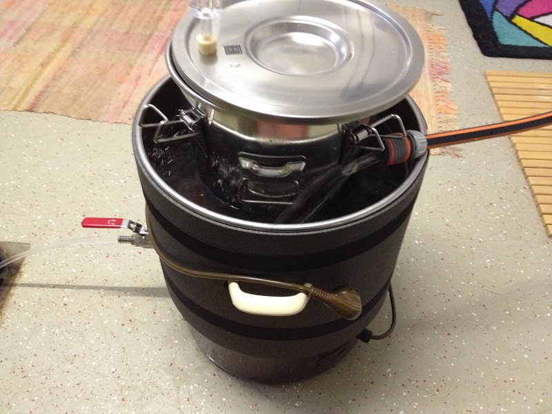 Um keine Würze zu verlieren, musste ich den Filtersack bei der Entnahme an der Behälterinnenwand ausdrücken. Hoffentlich habe hierbei keine Infektion durch meine Hände eingebracht. Das muss ich irgendwie besser machen. Um die Zielstammwürze von 12°P zu erhalten, musste ich mit 4 Liter abgekochtem Wasser verdünnen und kam so dann auf 8,5 Liter Würze. Die Würze hatte zu diesem Zeitpunkt zufälligerweise 70°C und ich konnte direkt mit einer Läuterspindel messen. Tja, da ich vergessen hatte meine Kühlspirale in der letzten Kochphase einzubringen um sie zu sterilisieren, musste ich die Anstelltemperatur auf eine andere Art erreichen. Ich stellte den Gärbehälter in den Einkocher und füllte den Zwischenraum mit Eiswasser.
