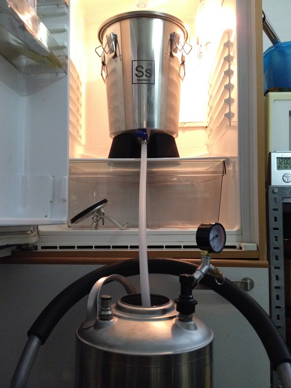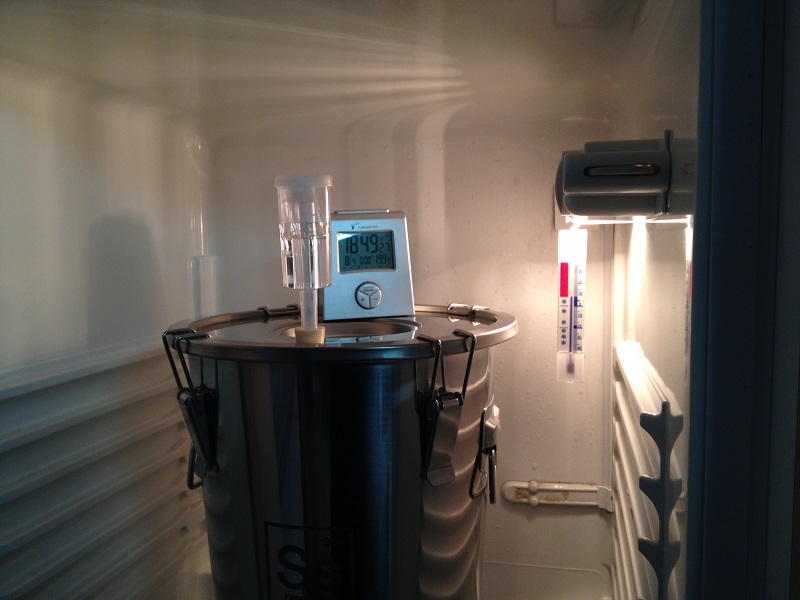 Die Hefe (SafLager S-23) ist über Nacht angekommen und arbeitet. Zweimal am Tag öffne ich die Tür, sorge somit kurz für Druckausgleich (ist das überhaupt nötig?) und kontrolliere den Gärspund und die Temperatur. In den Behälter selbst habe ich noch nicht geschaut.