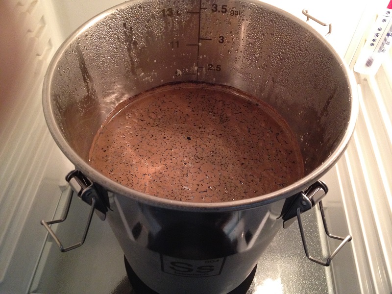 Nachdem das Eis geschmolzen war, ließ ich Kaltwasser oben zulaufen und öffnete den Ablasshahn am Einkocher so weit, dass sich ein gleichbleibendes Niveau einstellte. So kam ich dann nach ein paar Minuten auf etwa 20°C und konnte die Hefe zugeben und belüften. Den Kühlschrank hatte ich auf 10°C voreingestellt und dient seit Mittwoch Abend als Gärkeller.