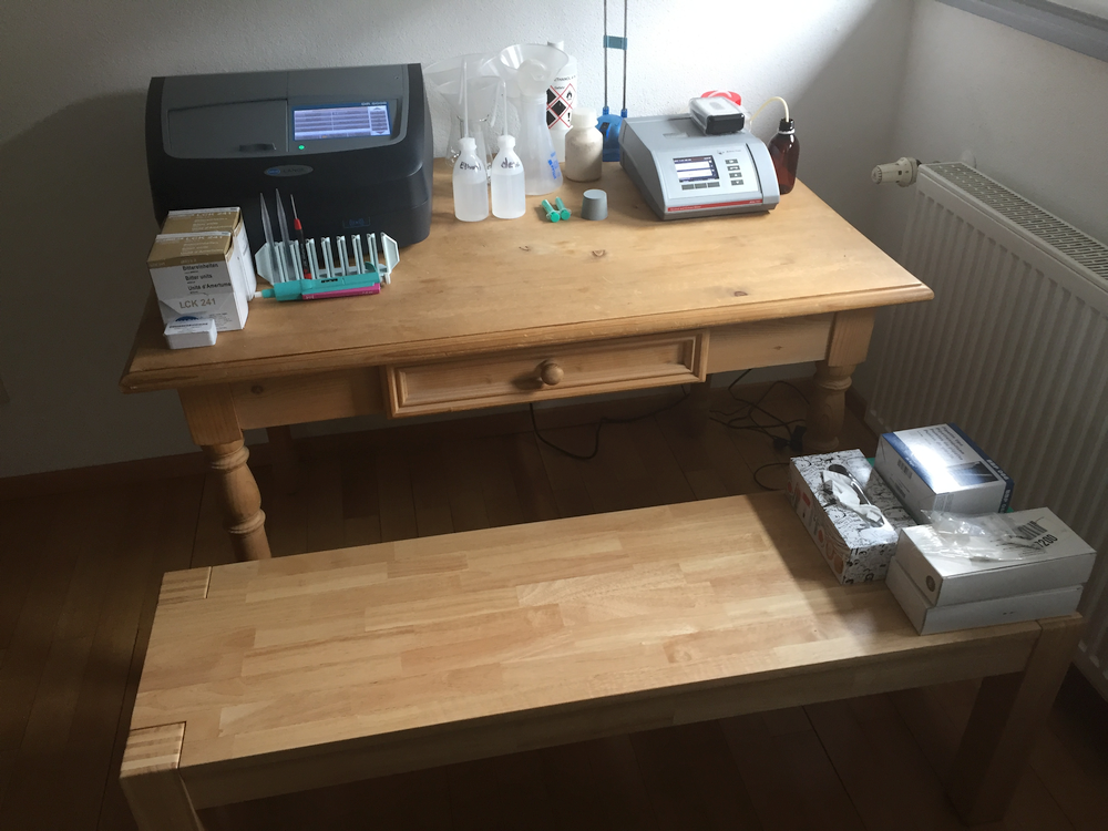 Meine kleines Labor steht parat und ist betriebsbereit. Die Automaten nebst den nötigen Reagenzien und Labormittel sind am Start und das gesamte Gefüge ist als gemütliche Sitzecke eingerichtet - für die harten Fälle :-)