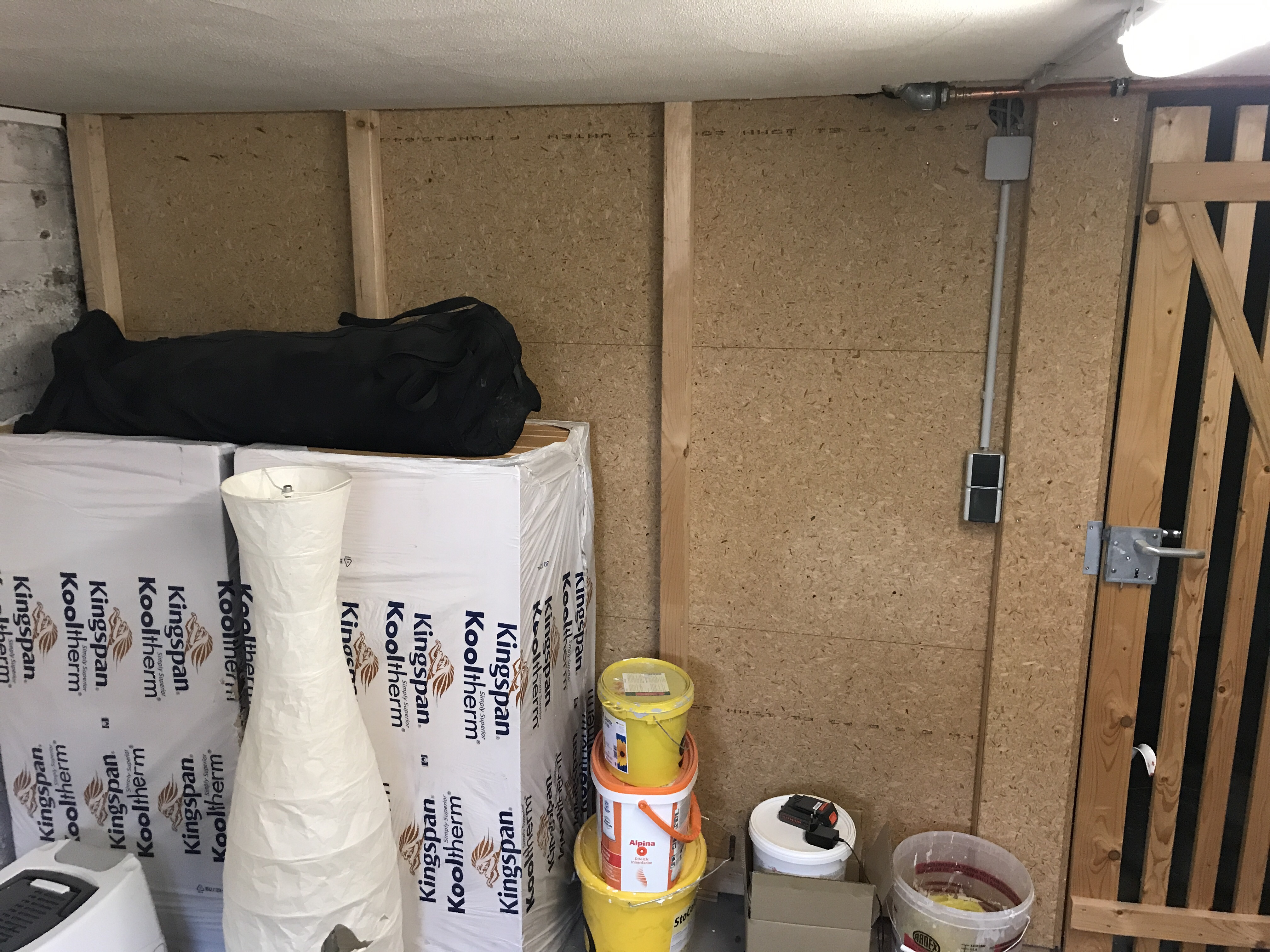 Hier sieht man die Seitenwand zum restlichen Keller. Das Holz muss wahrscheinlich mit feuchtraum geeignetem Rigips verkleidet werden, damit es nicht wie ein Schwamm wird, oder? Die Türe bleibt so. Dann kann die Luft zirkulieren.