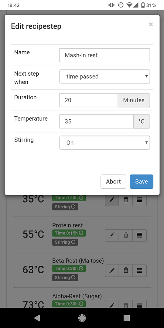 - Ein Rezeptschritt definiert dabei jeweils: Zieltemperatur, Rührwerk an/aus, Abbruchkriterium (automatisch nachdem Zieltemperatur bestimmte Zeit gehalten wurde oder manuell).