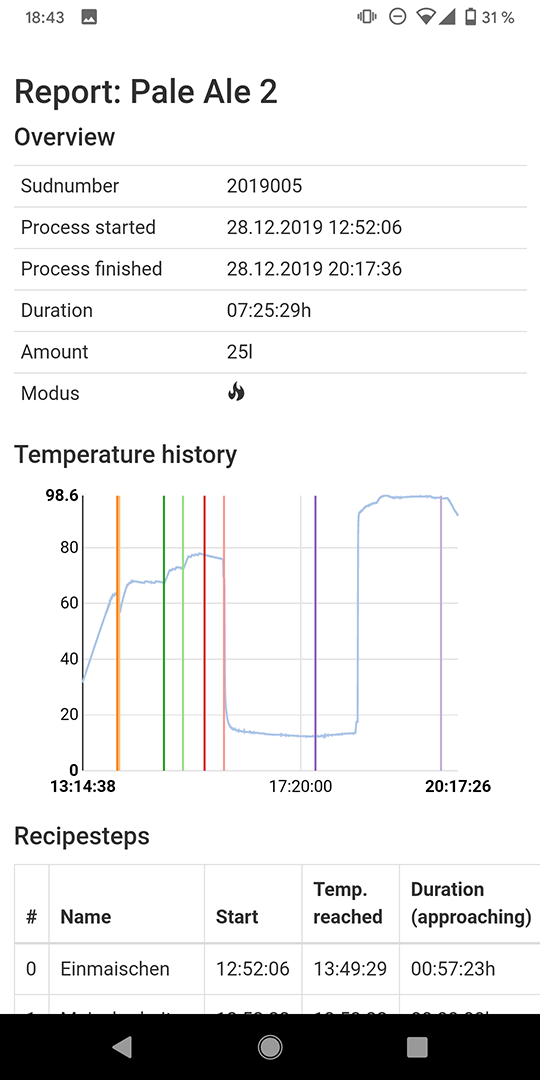 - Nach dem Sud/ der Vergärung steht ein umfangreicher Log zur Verfügung, der neben manuellen Kommentaren auch nochmal eine Übersicht der Temperaturführung in grafischer und textueller Form bietet.