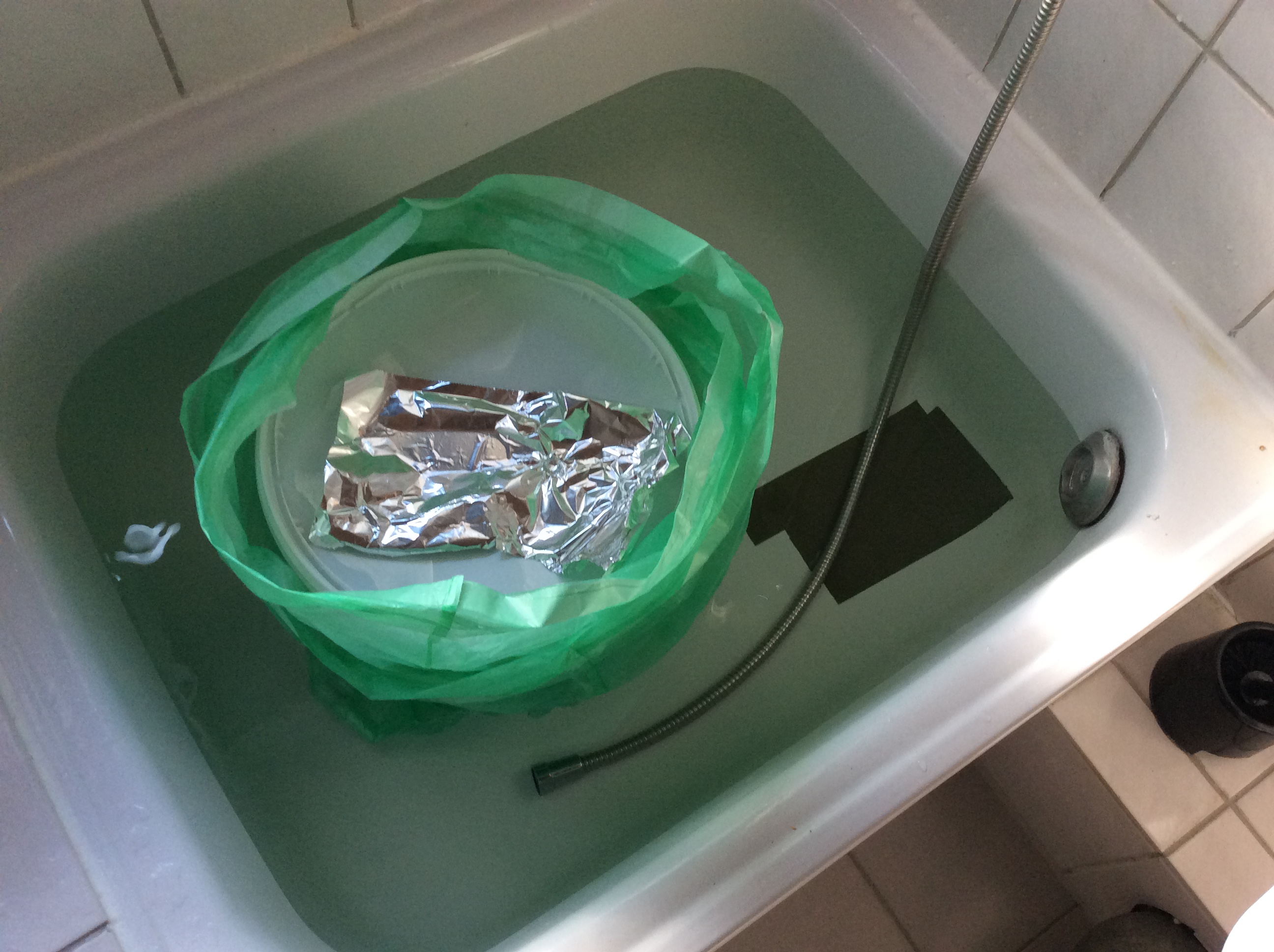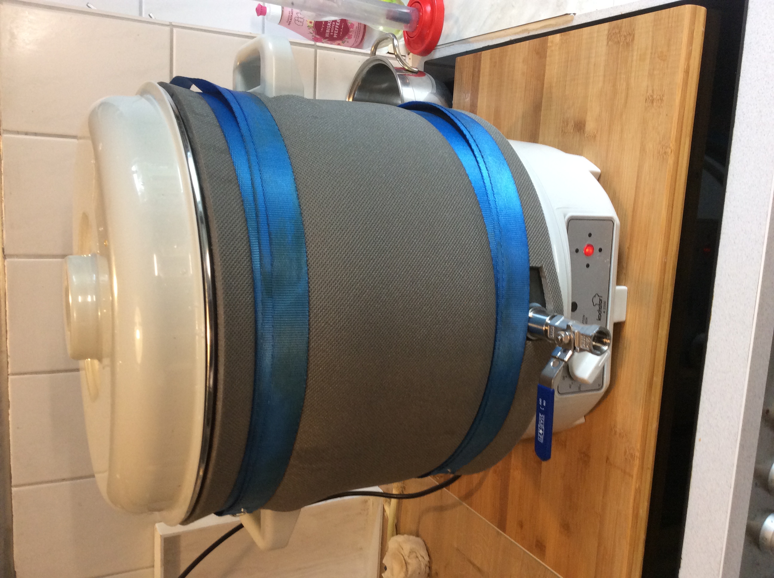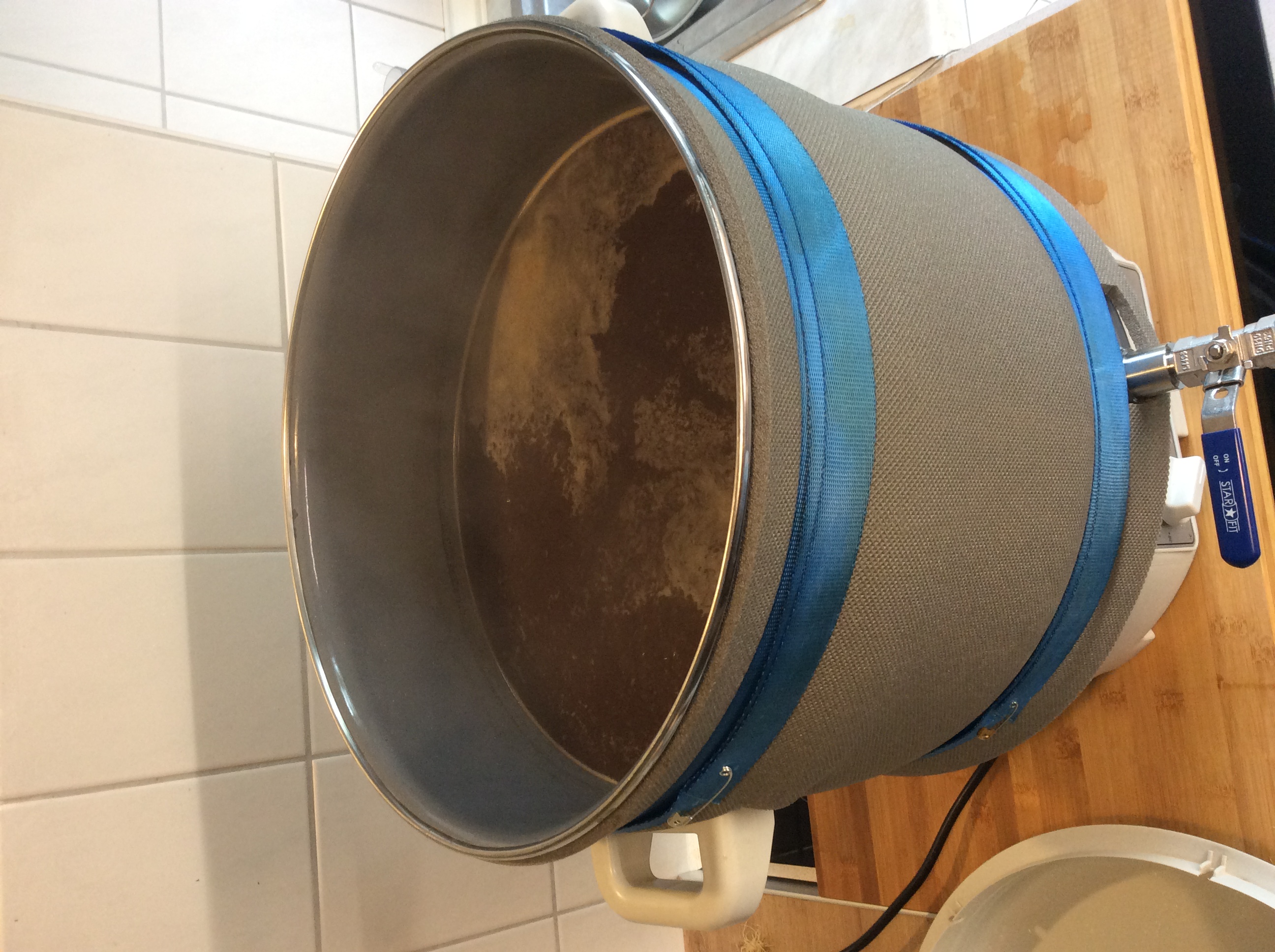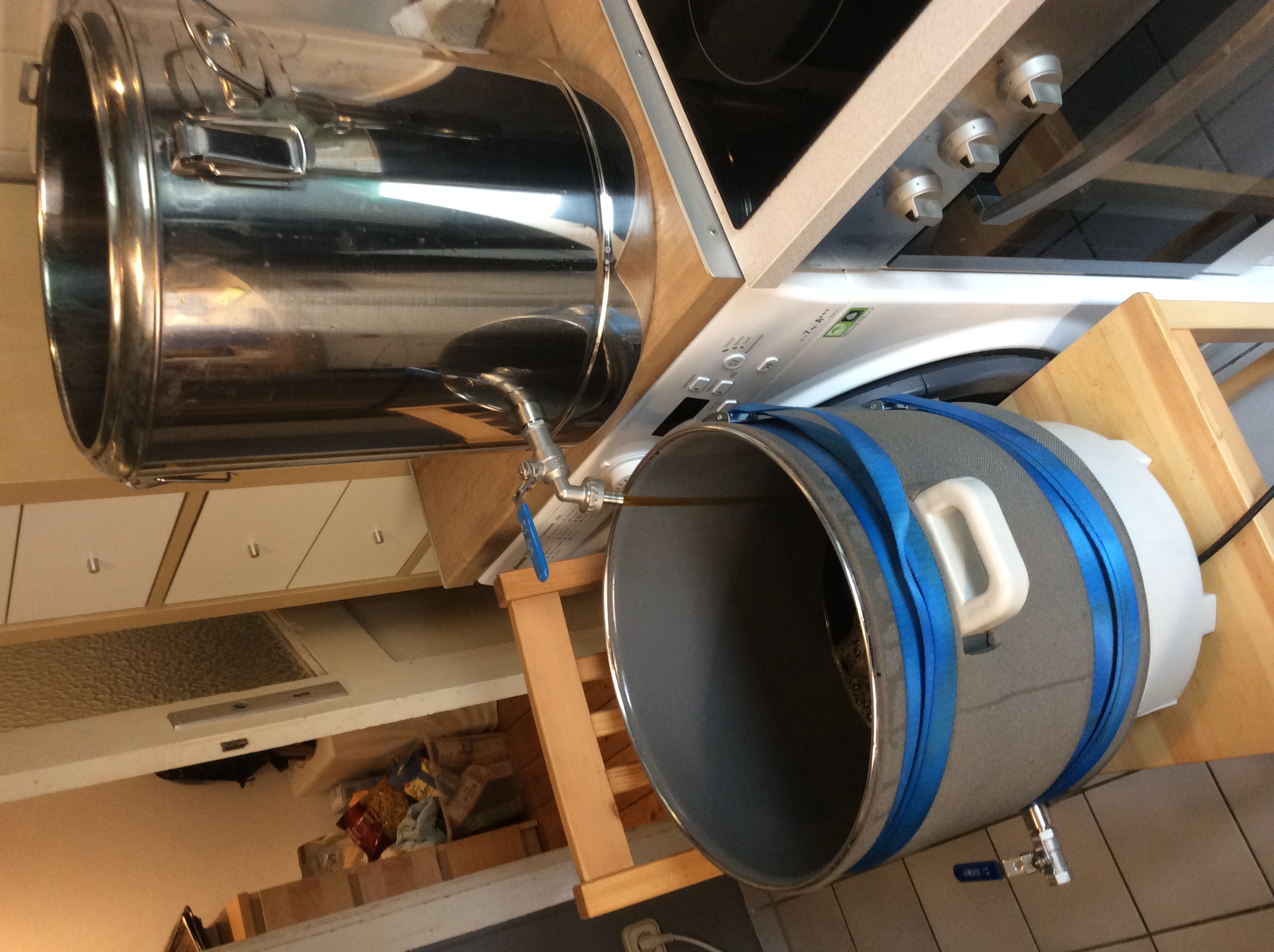 Heute war mal wieder Brautag, allerings deutlich kürzer als sonst, da ich „the brew bag“ genutzt habe. Bier war ein English smoked mild. Los ging es mit dem Thermopot und dem einzigen Guss. Ich nutzte um das Wasser auf Temeratur zu bringen meinen sous vide Stick. Die Vorteile: Präzise Temperatur und man kann den Stick nach erreichen der Temperatur einfach ne halbe Std laufen lassen damit der Thermopot schnell auch durchwärmt. Dann kam the brew bag rein und unter rühren anschließend das Malz. Temperaturcheck : 67 Grad. Perfekt! Deckel drauf und Däumchen drehen. Eine Std später holte meine nicht zur Nachahmung empfohlene Konstruktion den Sack aus dem Thermopot. Dieser wurde dann mit den Silikonhandschuhen ordentlich ausgedrückt. Das ging recht easy. Der Vorteil: statt x1.2 verliere ich nur x0,6 Flüssigkeit. Stammwürze ergab 10,5% bei 17,9 Litern was eine Sudausbeute von 52% bedeutete. Ich wollte auf 12% kommen und musste nichts weiter tun als ganz normal das Hopfenkochen zu starten. Am Ende waren es 12,5%. Super. Dann gings nach dem Whirlpool in den Gäreimer der in zwei Müllsäcken stehend zum Abkühlen in die Duschwanne kam. Dann wurde sie bis zum Anschlag mit kaltem Wasser gefüllt und kühlte so den Sud in 3 Stunden auf 20 Grad runter. Als letztes kam noch die vorbereitete Irish Ale dazu und nun heisst es warten. Der ganze Brautag war inkl. Vorheizen und Kochen bei 4 Stunden. The brew Bag hat wie vom Hersteller behauptet kaum was durchgelassen. Das Spindelröhrchen zeigt es ganz gut. Die Würze war mindestens genau so klar wie beim normalen Läutern. Alles in Allem bin ich zufrieden!