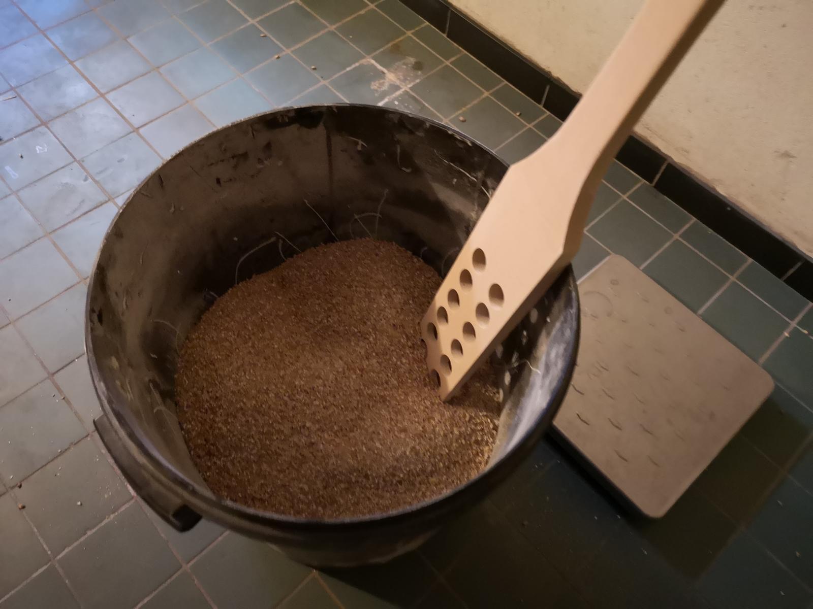 - nachdem die zweite hälfte Eingemaischt wurde ist die Welt im Bottich wieder in Ordnung, das Störblech tut seinen Dienst und die Maische fährt nicht mehr Karussel. Die Restlichen Malznester werden schnell noch mit dem Paddel untergemischt.