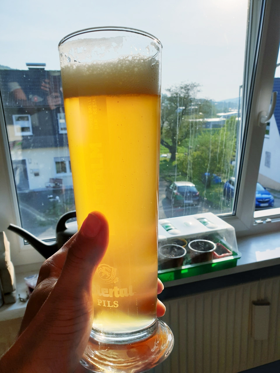 Erster Eindruck: Flaschengärung durch (trotz ~21°C), was mich sehr freut, weil die Kveiks da ab und zu rumzicken. Leicht grasig noch, aber schon sehr lecker, tolle Schaumstabilität. Mein leichtes Mittags- und Gartenarbeit-Bier für den Sommer, ziemlich genau so, wie ich es haben wollte. :Bigsmile