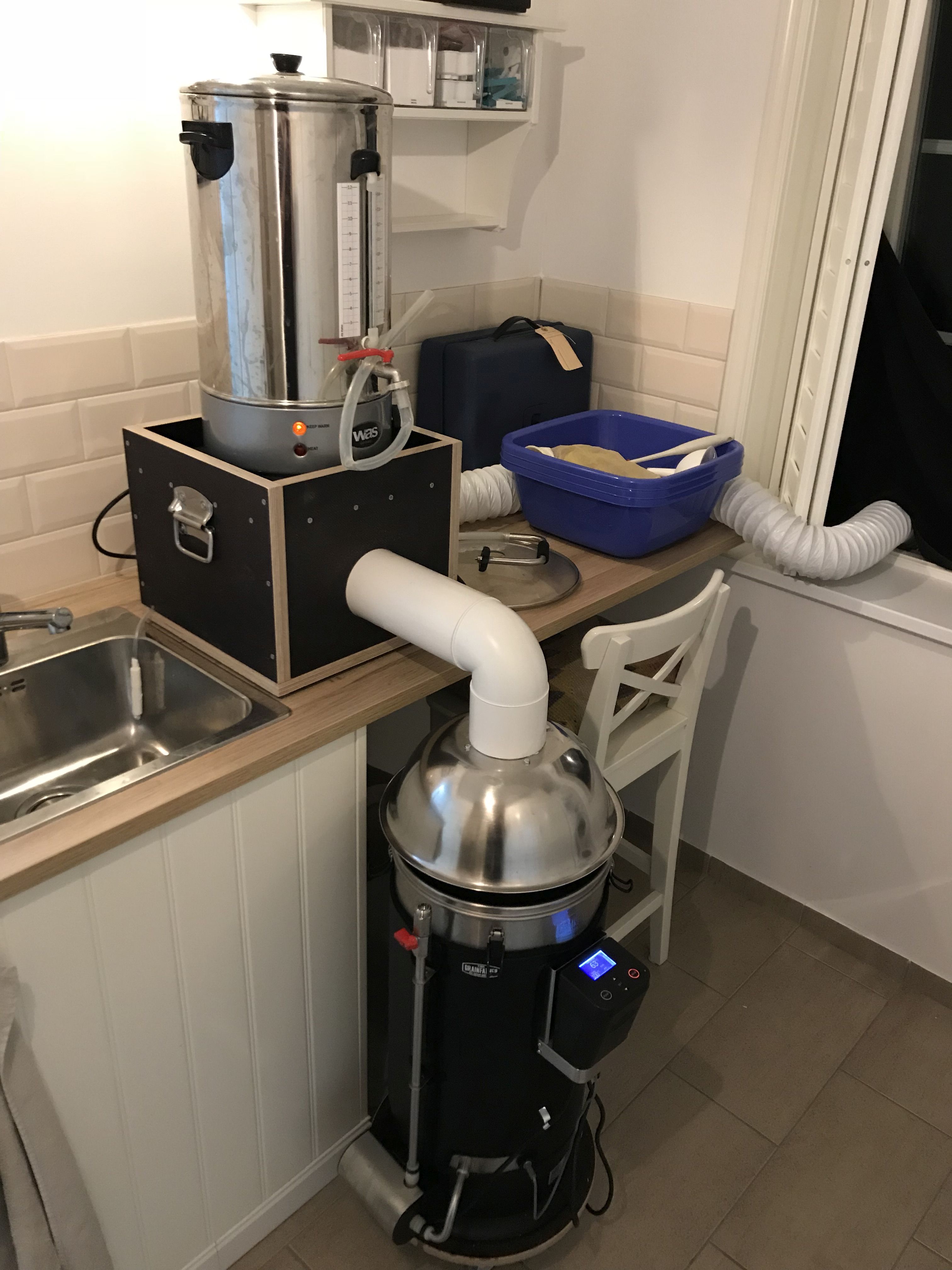 Ich hab bis dato immer in meiner Garage gebraut. Leider hab ich dort kein fliessendes Wasser und muss zudem alles immer umständlich auf und wieder abbauen. Zudem musste ich meinen Nachgussheizer gefährlich auf ein Regal stellen, wenn ich mit einem Schlauch und mit Gravitation nachgiessen wollten. Darum braue ich seit kurzen im meiner Waschküche. Das Problem: Dort hab ich aber keinen Dampfabzug - und Sauna mag ich nicht