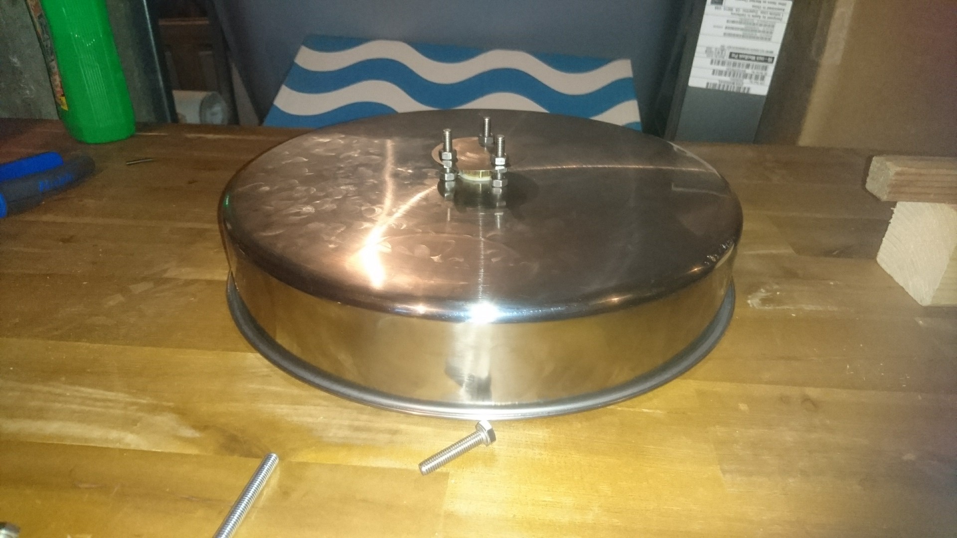 Falls sich jemand wundert: Der M8 Bolzen der bei mir mittig in der Prallplatte sitzt hat keine tiefere Bedeutung. Der is da nur um ein Loch in der Prallplatte zu verschließen welches da vorhanden war. (Weil die Platte wie gesagt recyclet war und ursprünglich Teil einer Terassenlampe war..)