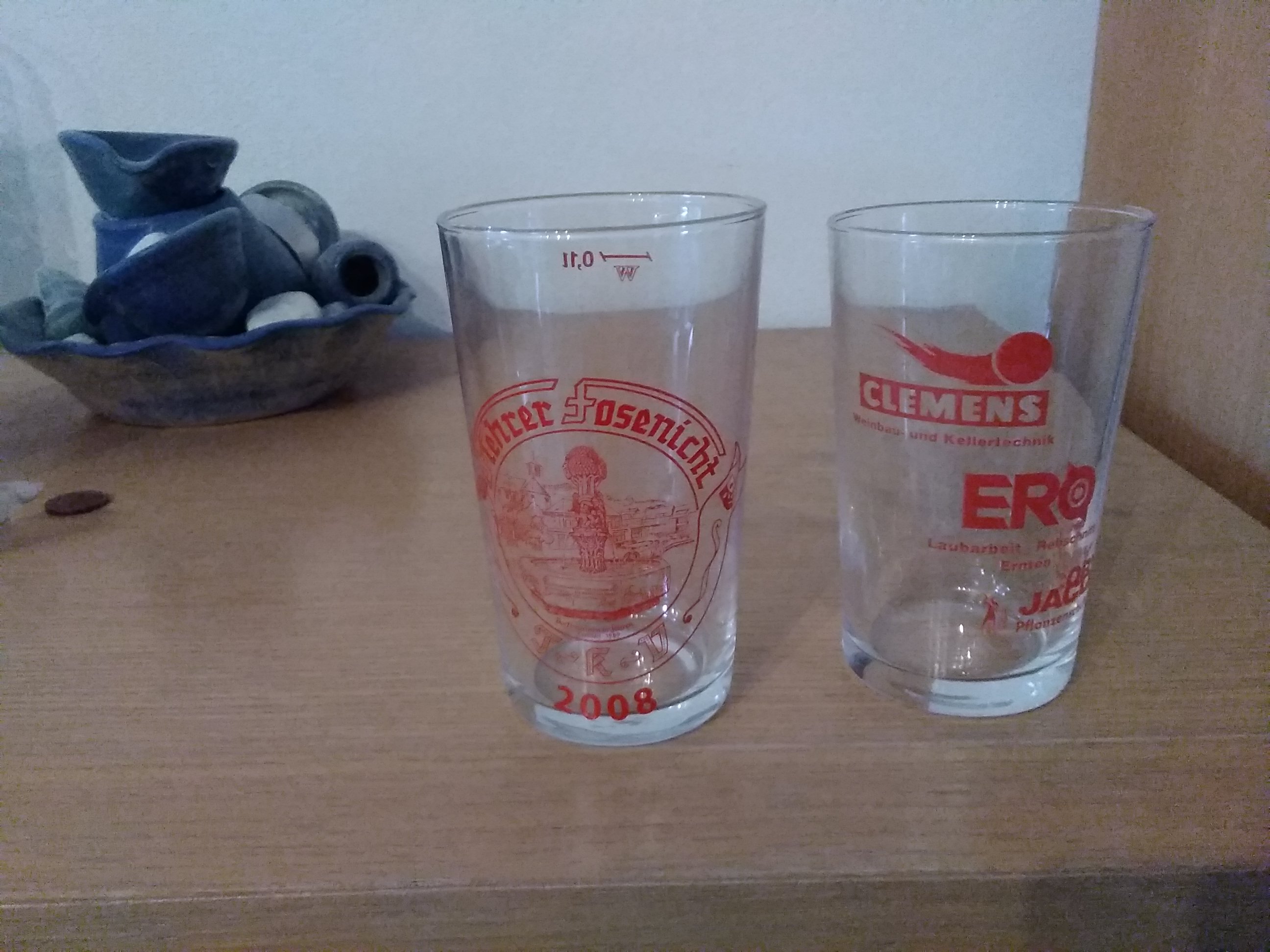 Es könnte sein, dass wir im Verein in den Tiefen unserer Katakomben ähnliche Gläser haben. Waren ursprünglich die berühmt berüchtigten Weinprobiergläschen. Gab es in verschiedenen Größen, meist auch mit Aufdruck. Es könnten aber noch ein paar unbedruckte existieren.